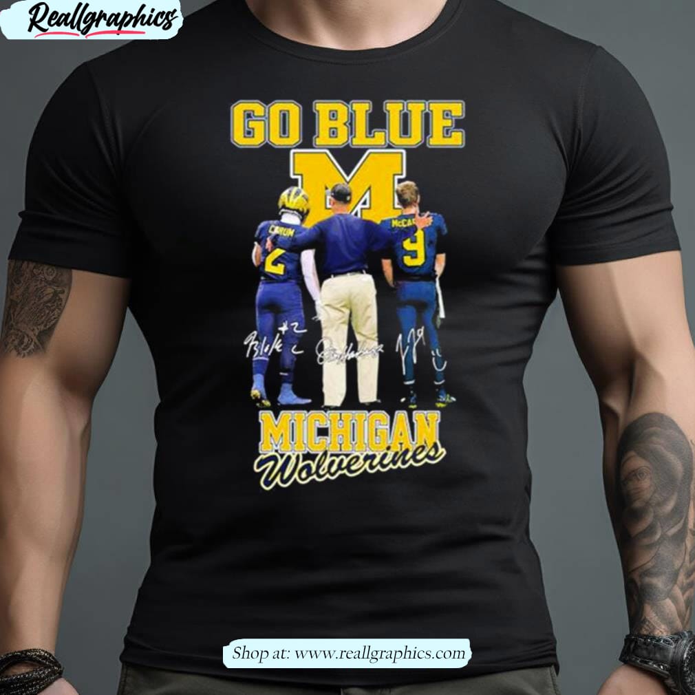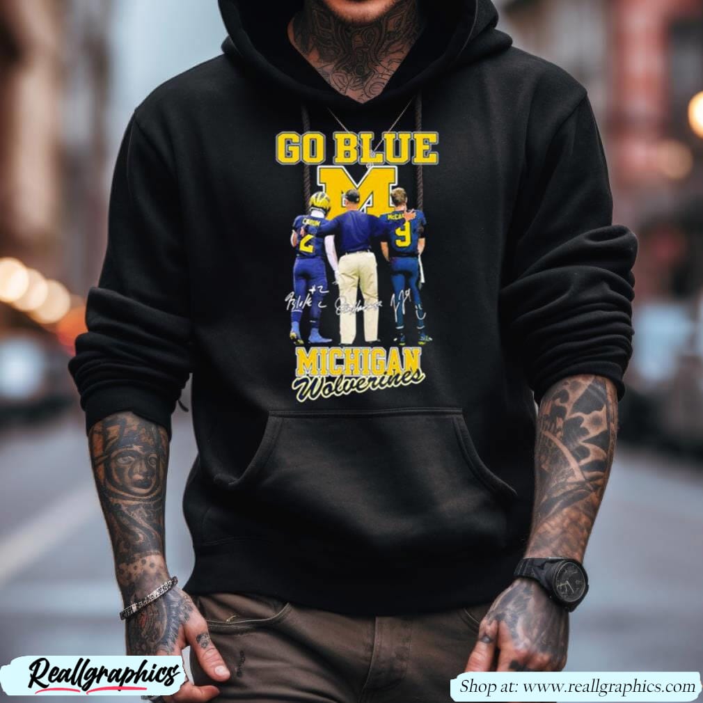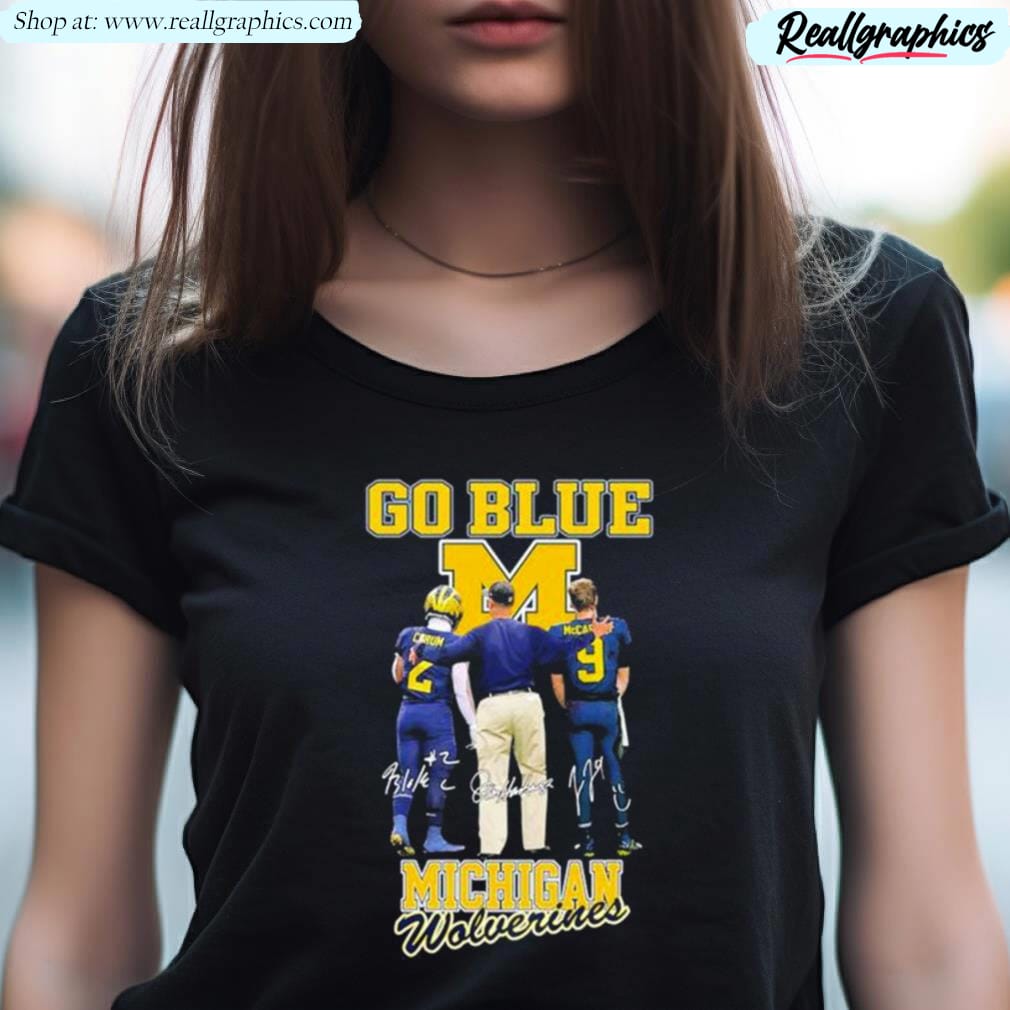 The Go Blue Michigan Wolverines Signature Shirt is a must-have for any die-hard Michigan Wolverines fan. With its bold design and signature logo, this shirt is sure to turn heads wherever you go. Made from high-quality materials, it offers a comfortable fit and durability that will last season after season. Whether you're heading to a game or just showing off your team pride, the Go Blue Michigan Wolverines Signature Shirt is the perfect addition to your wardrobe.