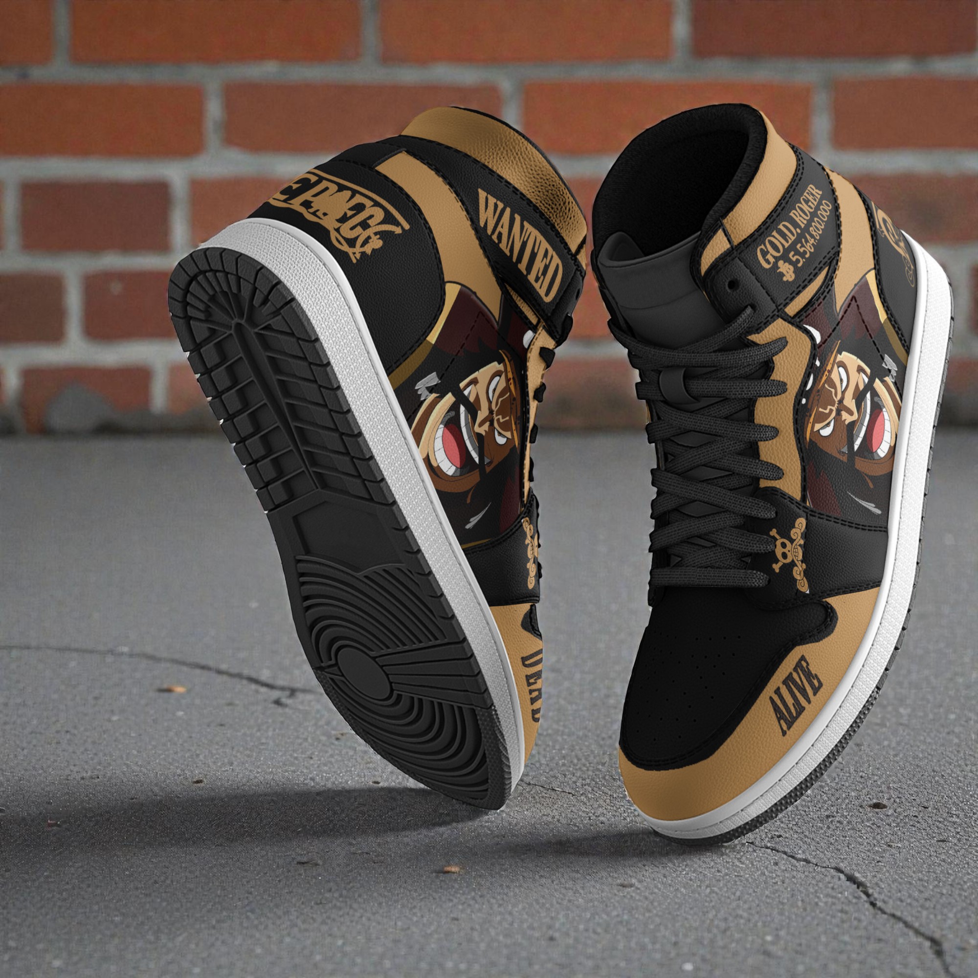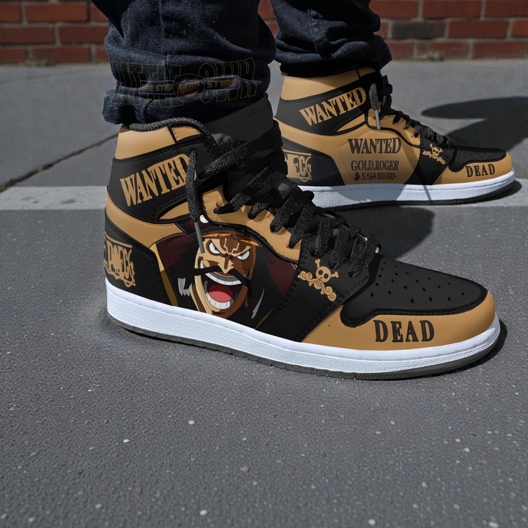 In the world of One Piece, the allure of the legendary pirate Gol D. Roger is as bold as the adventures he inspired. These sneakers echo that spirit with a design that feels lifted straight from the stormy seas and the storied “Wanted” posters that mark an outlaw’s path. The shoes wear their homage loudly—black and tan blocks form a rugged backdrop to the large cartoon-style villain face that commands attention. Typography isn’t just lettering here; it’s a statement. The stacked words DEAD and GOLD.ROGER reverberate in bold serif and western-style script, evoking the cinema of a high-stakes chase or a pirate’s wanted bounty. For anyone immersed in anime culture or One Piece fandom, these sneakers aren’t just footwear; they’re a wearable emblem of rebellion, adventure, and legacy. They embody a feeling, the restless energy of a pirate ready to carve their own story. Collectors of sneakers with a story will appreciate the customization, which enriches each pair with a unique artistic edge. Beyond personal style, they subtly gesture toward a shared passion—perfect for those moments spent among fellow fans, whether at conventions or casual meetups. These One Piece sneakers capture more than just a character—they hold the mythos of a legend and the thrill of a chase. For someone who treasures that blend of art and identity, they’re the captain’s choice.Gol D Roger Wanted Boot Sneakers Custom One Piece Anime Shoes
