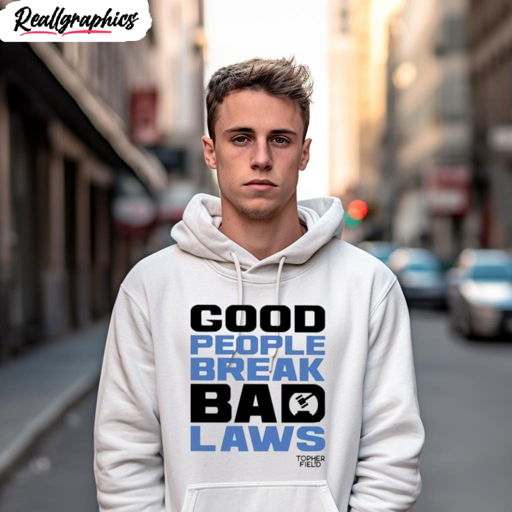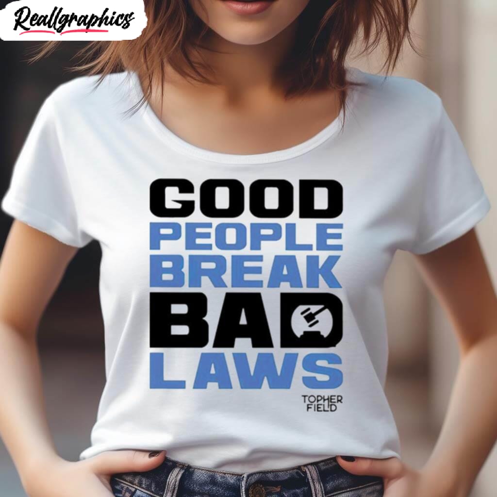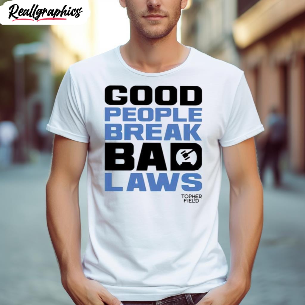 The Good People Break Bad Laws Topher Field Shirt is a stylish way to make a statement about social justice and civil rights. It’s made from a soft and lightweight fabric with a graphic of Field's powerful image featuring a clenched fist. The shirt sends a powerful message of standing up for what one believes in and taking a stand against injustice. Perfect for anyone looking to show their support for civil rights, the Good People Break Bad Laws Topher Field Shirt is sure to make a statement. The shirt is the perfect blend of fashion and comfort, making it suitable for any and all occasions.