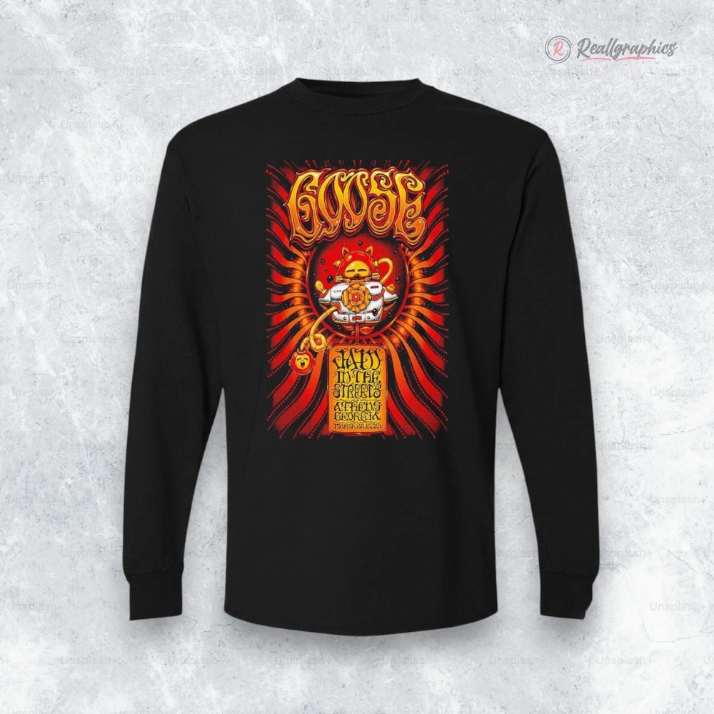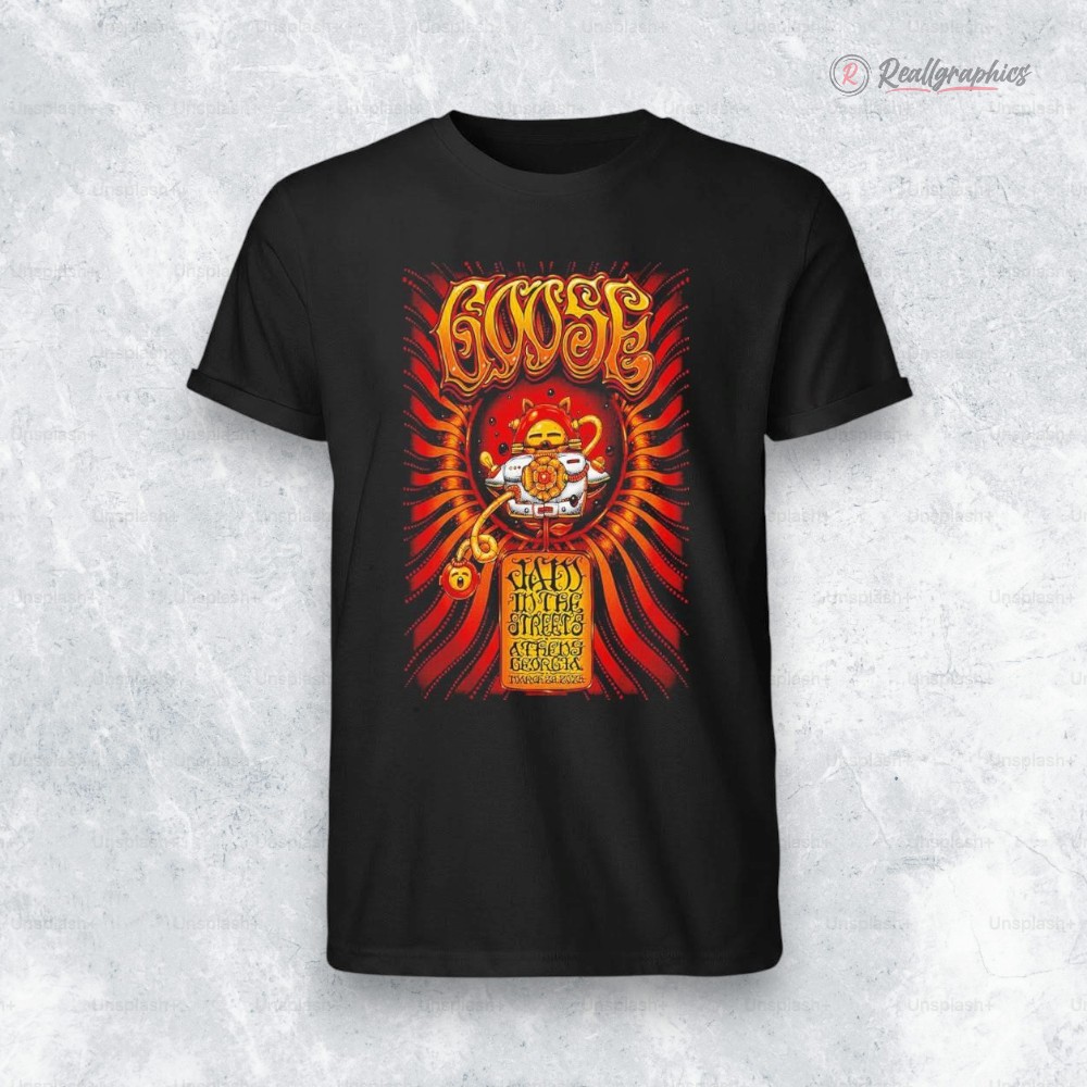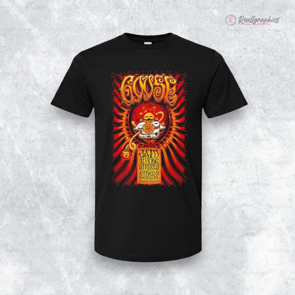 There’s something electric about connecting to a moment in music history—not just the sound, but the whole vibe. That’s exactly what this shirt channels. Imagine a wild red and orange spiral spinning behind a circular emblem that feels like it was plucked straight from a 70s concert poster. The ornate hand-drawn lettering loops and twists, pulling your eyes right into the heart of it. Then there’s that illustrated mascot figure, bold and iconic, framed by decorative borders that give it the authentic feel of a vintage gig flyer. If you live for music culture or have a soft spot for retro psychedelic art, this shirt is a quiet nod to that passion. It’s for the folks who recognize the power of design to celebrate a band’s story beyond just the soundwaves. Whether you’re wearing it to a show, tossing it on for a weekend outing, or adding to a collection of music-inspired keepsakes, it fits right into the lifestyle of anyone who loves vintage aesthetics with a fiery edge. And yeah, this goose washington street poster shirt makes a thoughtful pick if you’re hunting for a gift—especially for someone who cherishes the energy of live music and the art that danced alongside it. It’s not just clothing; it’s a snapshot of a scene, a feeling you can wear.