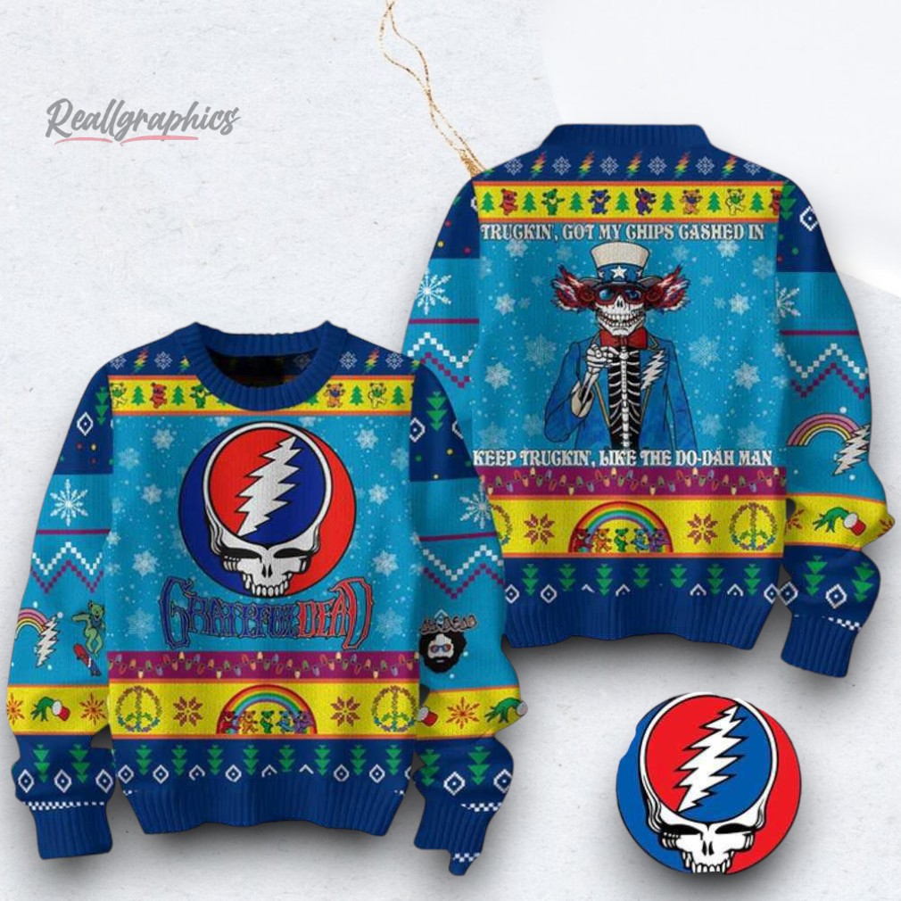 Truck on into the holiday season with this groovy sweater! Featuring dancing bears, psychedelic colors, and a whole lotta Christmas cheer. It's the perfect way to show off your love for the Dead and spread some festive vibes. Get yours before they're gone! 🎄💀🎅