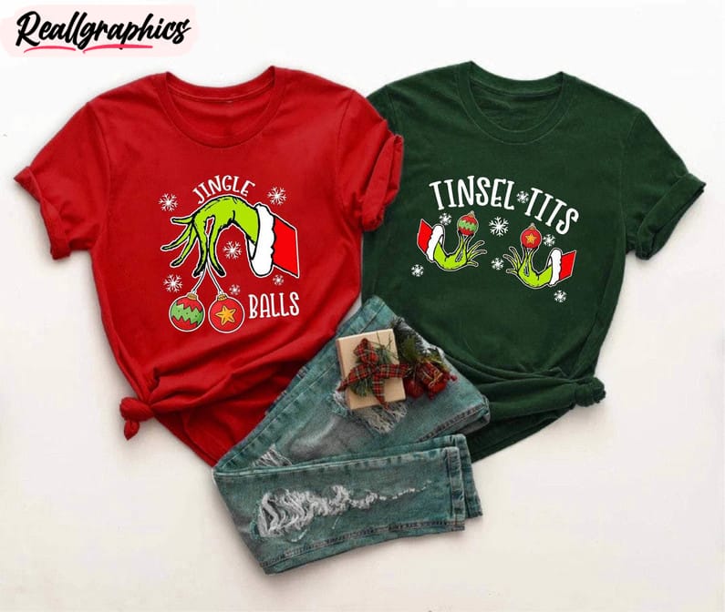 The Grinch Jingle Balls And Tinsel Tits Shirt Christmas Matching Tank Top Sweater is the perfect outfit for spreading some holiday cheer. This festive tank top sweater combines the cheeky humor of the Grinch with the merry spirit of Christmas. The vibrant colors and playful design make it a fun and eye-catching choice for any holiday gathering. Whether you’re attending an ugly Christmas sweater party or just want to add some holiday spirit to your wardrobe, this tank top sweater is sure to be a hit. Its cozy and comfortable material ensures that you’ll stay warm and stylish all season long. Embrace your inner Grinch and get ready to jingle those balls and show off your tinsel tits this Christmas!