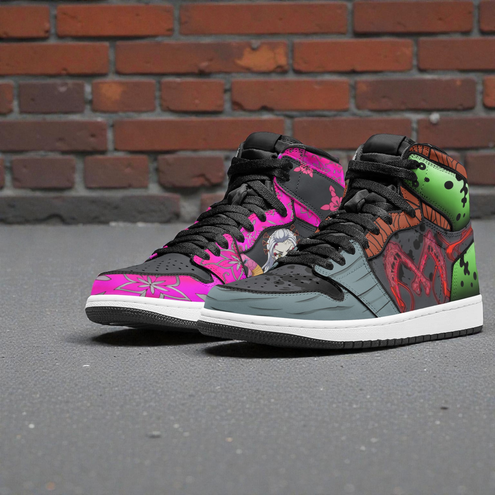Why choose between the Upper Moon Six siblings when you can wear both? This split-design pair gives you Gyutaro on one side and his sister Daki on the other, capturing the whole Entertainment District Arc vibe in one go.