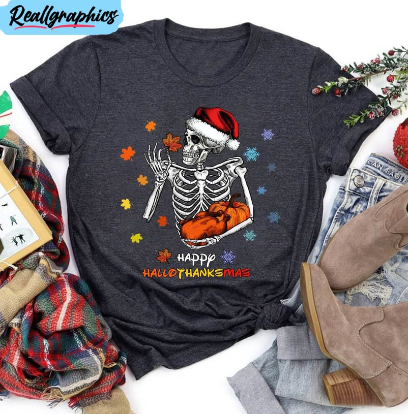 The Hallothanksmas Sweatshirt Halloween Skeleton Merry Christmas Sweater Hoodie is the perfect clothing item for the holiday season. This unique sweatshirt combines the festive spirit of Halloween, Thanksgiving, and Christmas all into one design. Made from high-quality material, it is not only comfortable to wear but also durable. The hoodie features a skeleton design with Halloween-inspired elements like pumpkins, bats, and spiders, as well as traditional Christmas motifs like snowflakes, presents, and Santa hats. It is a great way to celebrate and showcase your love for all three holidays in a fun and stylish way. Whether you wear it to a holiday party or cozy up by the fire, this hoodie is sure to spread holiday cheer to everyone around you.