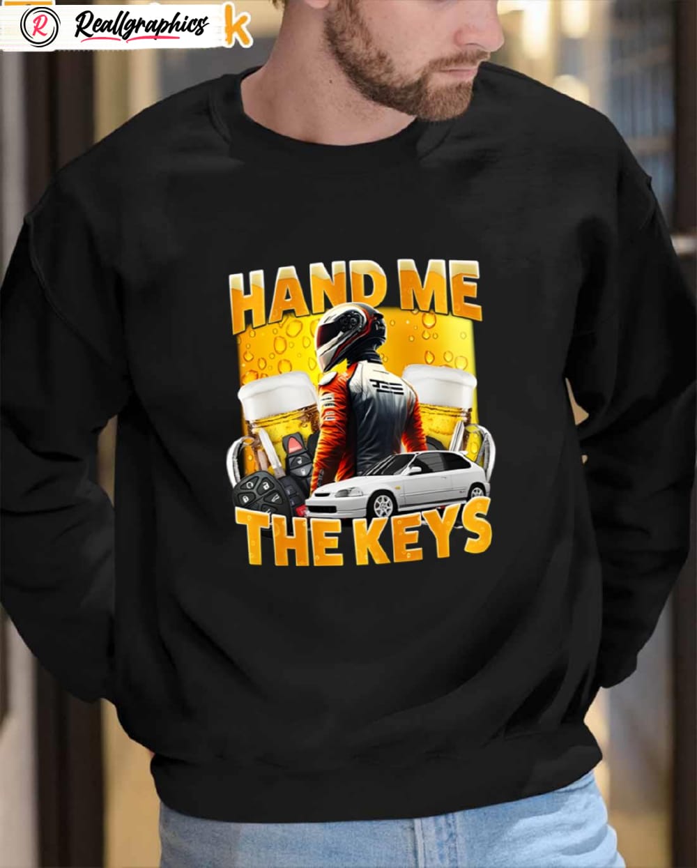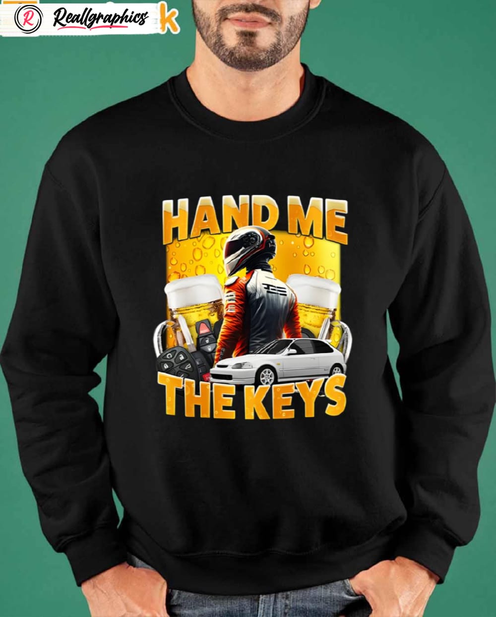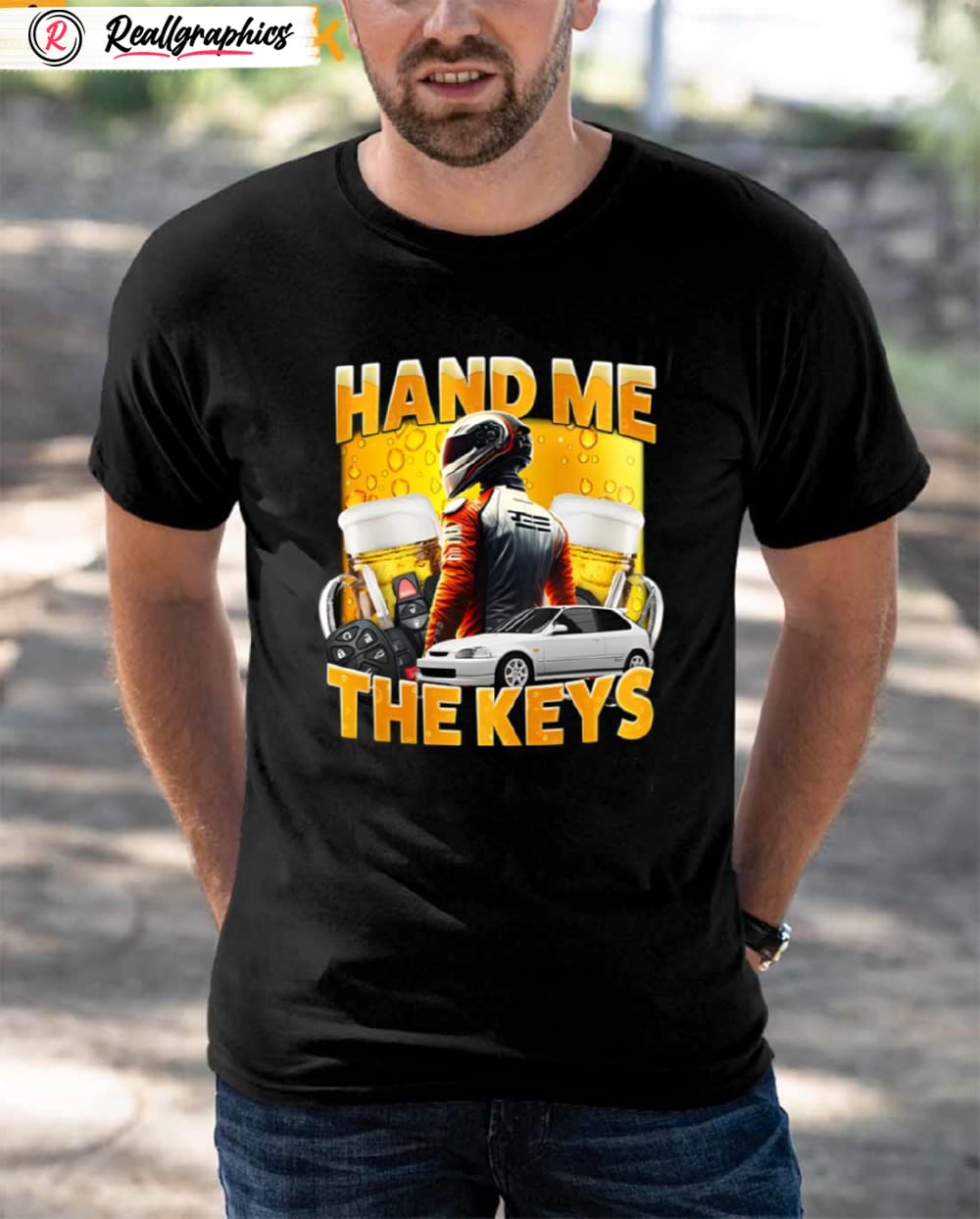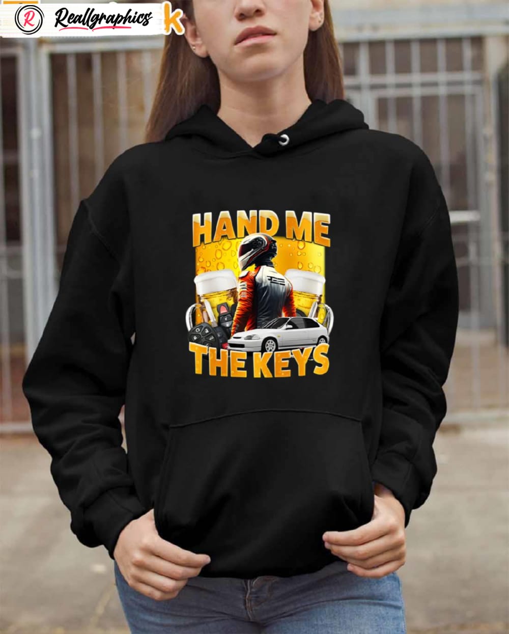 The Hand Me The Keys Shirt is a trendy and stylish piece of clothing that exudes a cool and casual vibe. It features a simple yet eye-catching design that is perfect for everyday wear. The shirt is made from soft and comfortable fabric, making it a great choice for lounging around or running errands. Its versatile look allows you to easily dress it up or down depending on the occasion. The Hand Me The Keys Shirt is a must-have addition to any fashion-forward wardrobe.