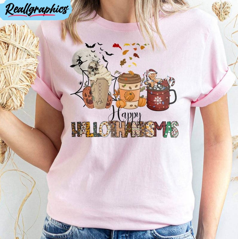 Happy Hallothanksmas Shirt, Funny Coffee Lover Halloween Short Sleeve Crewneck