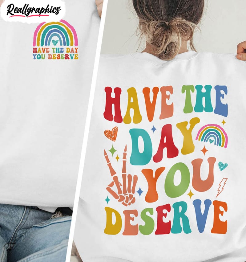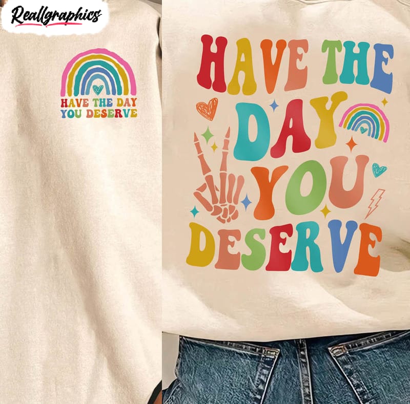 This positive vibes rainbow shirt is designed to give you the motivation to get through the day. The colorful rainbow serves as a reminder to seek out the positive in life, while the upbeat message encourages you to do what it takes to Have the Day You Deserve. Crafted from soft and breathable materials, the comfortable fit allows you to wear it during any activity. Whether you're going to work, or out running errands, this shirt is sure to give you plenty of positivity throughout the day. Best of all, the vibrant rainbow adds a cheerful flair that's sure to draw compliments everywhere you go.
