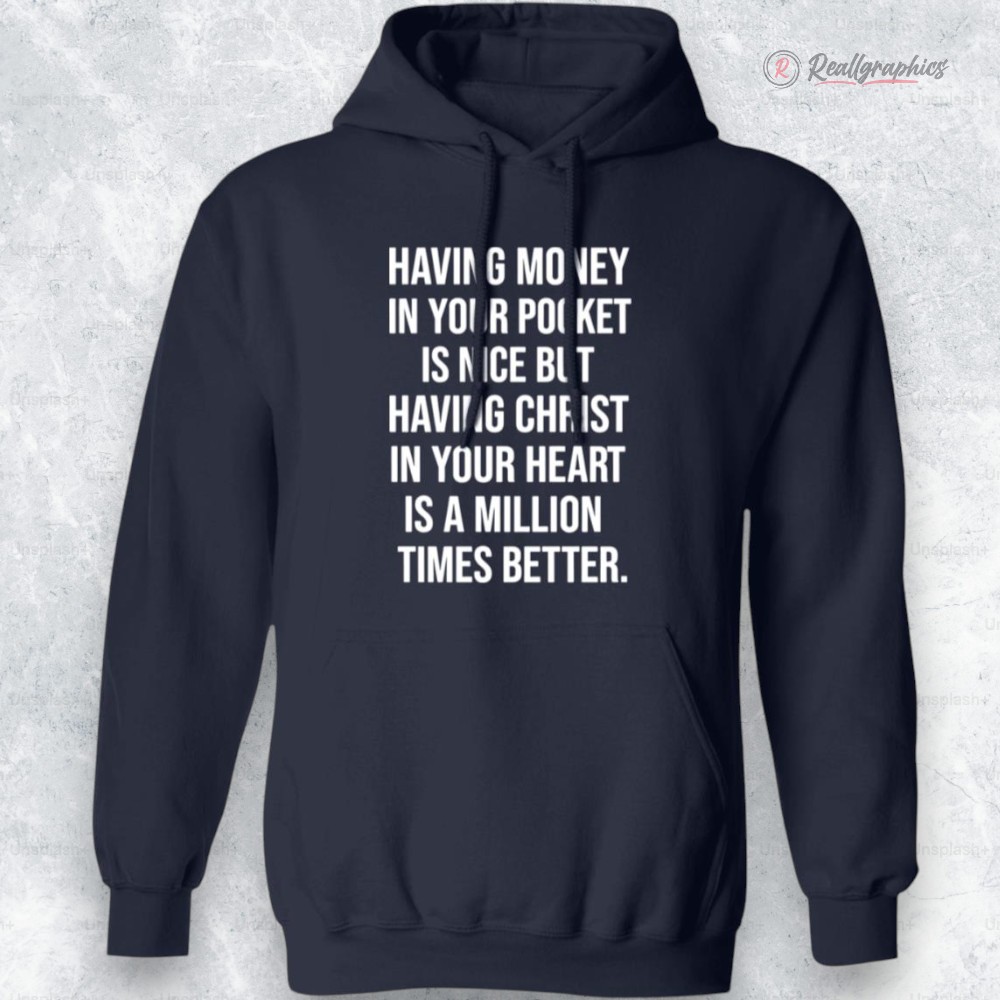 There’s something undeniably satisfying about a straightforward message that blends humor with a dash of truth. The bold, blocky typography sprawls across this dark navy hoodie in crisp white, creating a high-contrast statement that catches the eye without shouting. The letters stand tall and condensed, occupying the center with a confident, graphic presence that feels both casual and commanding. It’s the kind of design that wears like a tagline for anyone who appreciates a little wit wrapped around the simple joy of having cash on hand. This piece speaks to more than just the fashion-conscious—it’s for those who find a spark of motivation in everyday realities. If financial empowerment or cheeky positivity resonates, this shirt aligns perfectly. Friends who enjoy clever wordplay, family members marking a personal milestone, or anyone who likes their streetwear with a hint of ironic confidence will see the appeal instantly. It fits seamlessly into relaxed weekend wear, or as that lighthearted reminder tucked under a jacket on a busy day, offering both comfort and a subtle grin. Giving it as a gift carries the same clever zest, nodding to the recipient’s savvy or humor without ever being too on-the-nose. So when someone wants to showcase a little attitude about what really matters—whether in money or mindset—this hoodie is a quietly bold choice.