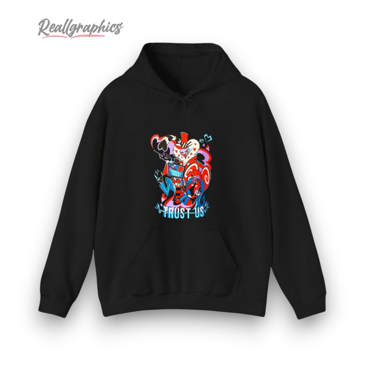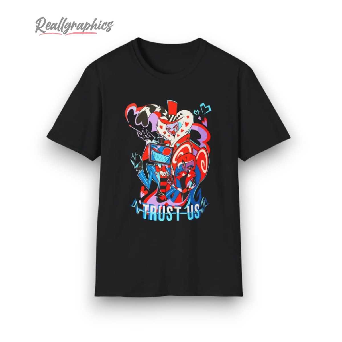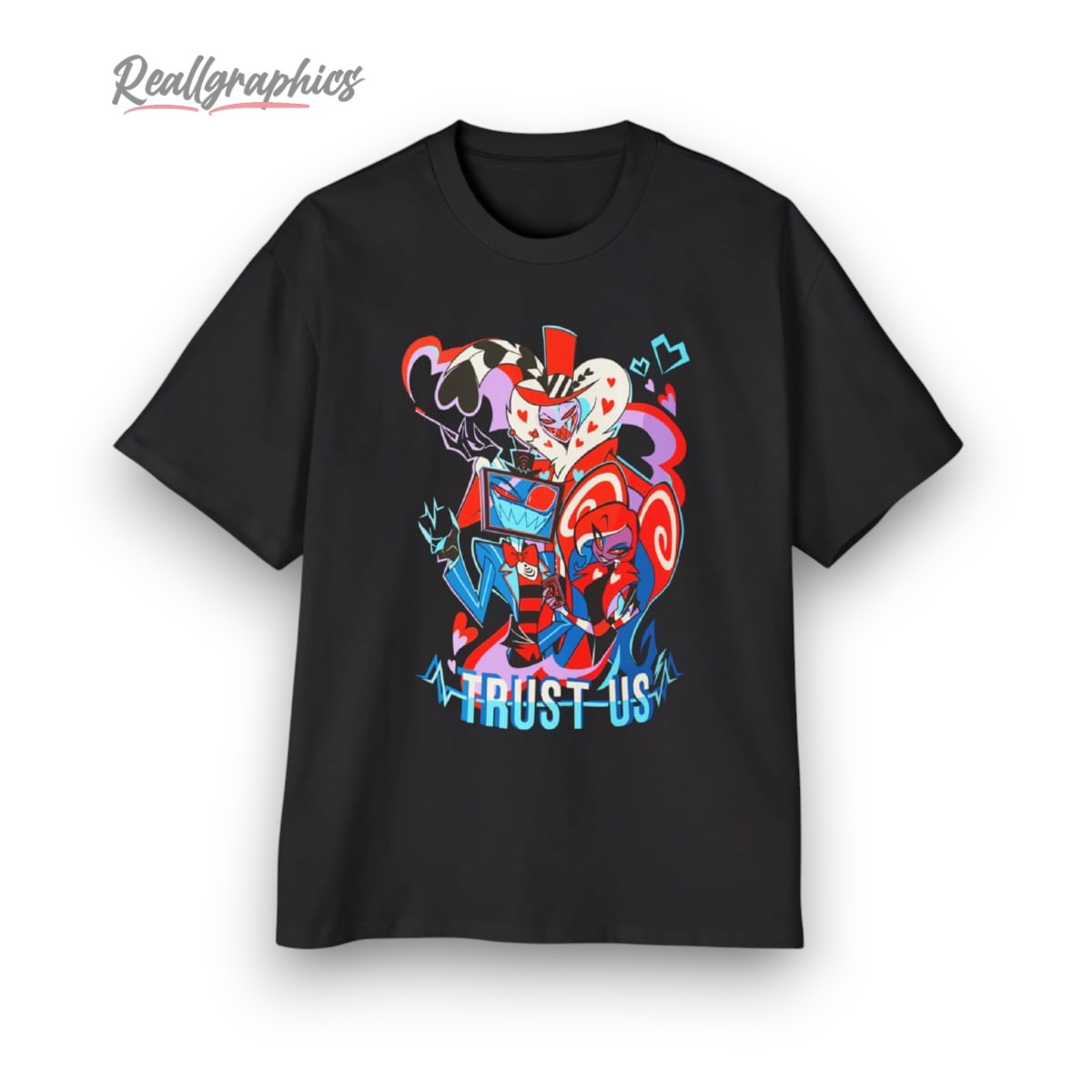 Dive into a world of vibrant colors and edgy characters with this eye-catching design. Featuring a bold graphic of quirky figures surrounded by playful hearts and lively patterns, this shirt makes a statement. The Trust Us text adds a touch of mystery and intrigue, perfect for fans of unique and expressive art styles. Stand out with this dynamic and whimsical design!Hazbin Hotel Trust Us Shirt