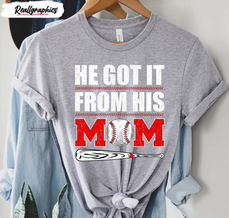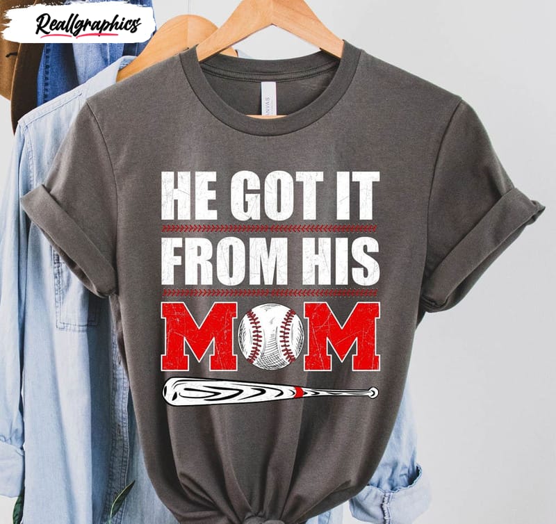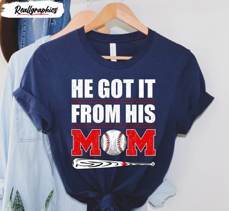 This He Got It From His Mom Baseball Funny Shirt is the perfect combination of style, humor, and baseball. The shirt features a vintage baseball logo, with the caption ‘He Got It From His Mom.’ The phrase is sure to get a few laughs from your friends, and will be sure to start conversations about baseball. The shirt is made of 100% cotton for a comfortable fit and is available in men's and women's sizes. Whether you’re at the ballpark, or just lounging around at home, this He Got It From His Mom Baseball Funny Shirt is a fun and stylish way to show off your love of baseball.He Got It From His Mom Baseball Funny Shirt