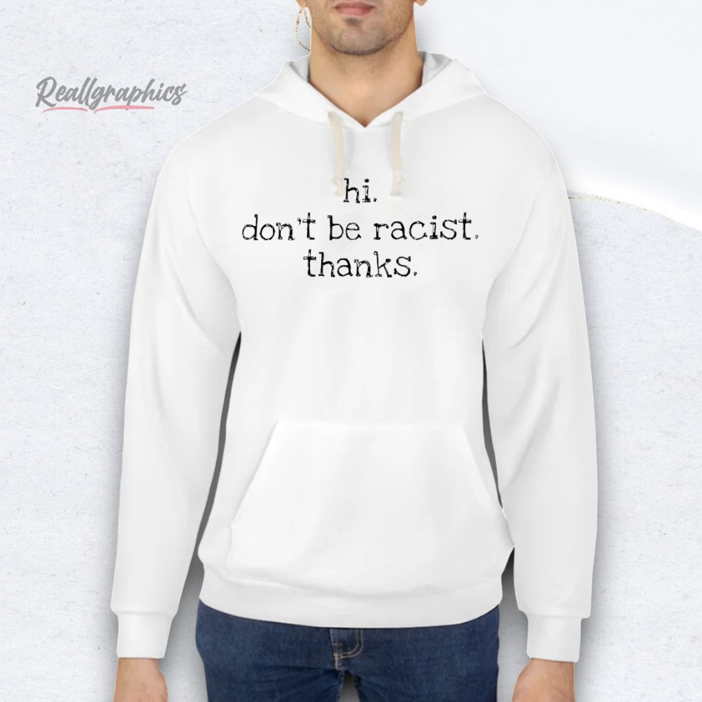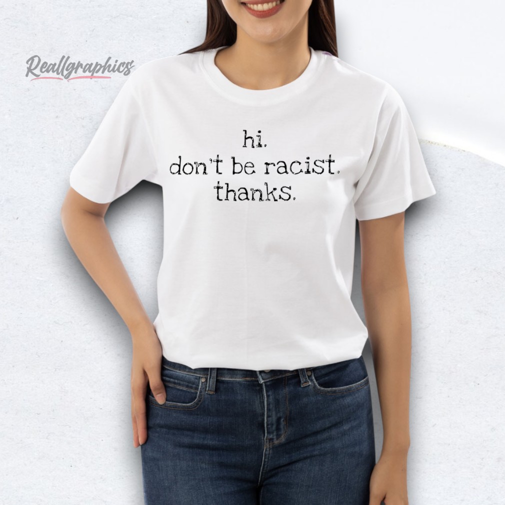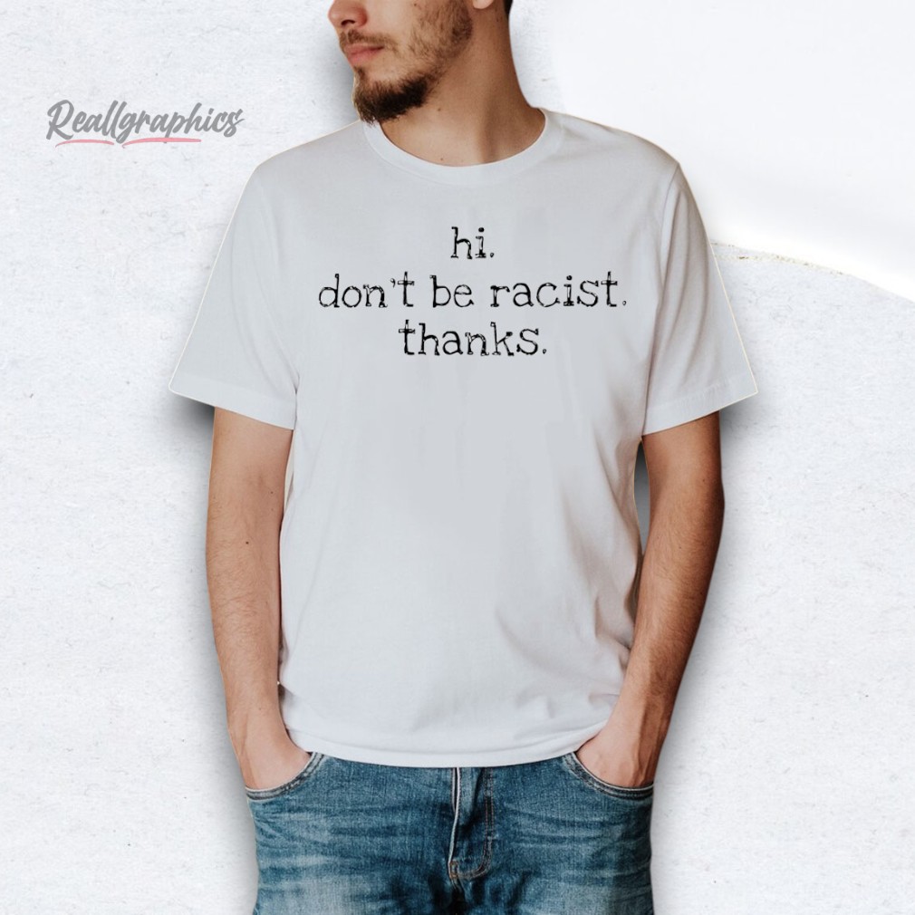 Spread positivity and kindness with this simple yet powerful message. A reminder to treat everyone with respect and understanding. Wear your values and let your clothing spark important conversations. Be the change! Hi don’t be a racist thanks Shirt