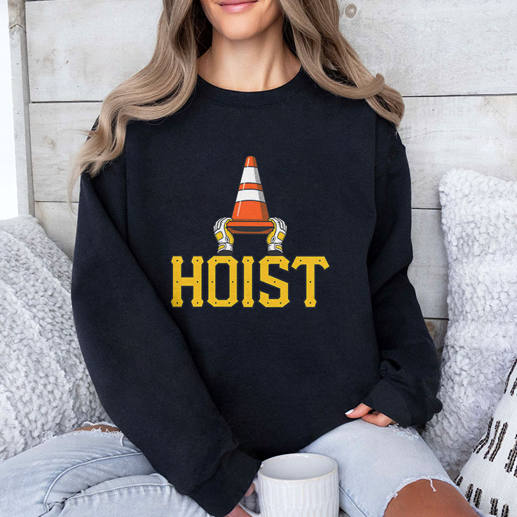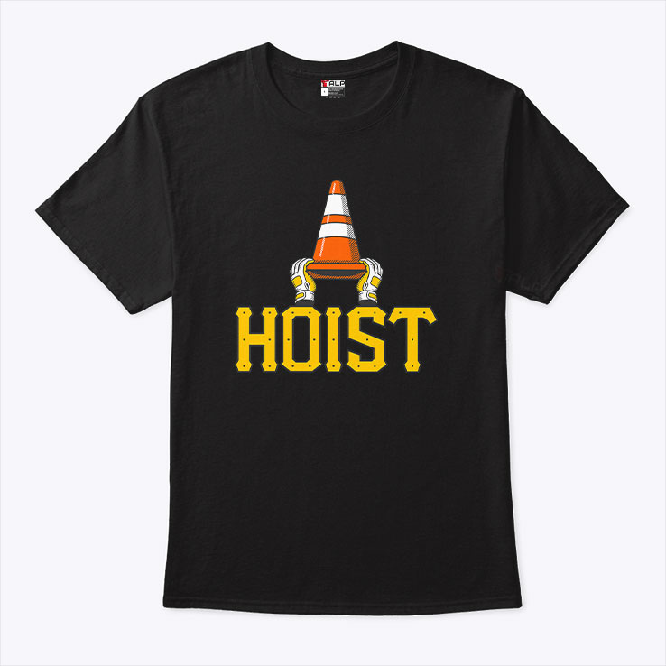 There’s something about the vibrant pop of that bright orange cone right on the chest that grabs your attention instantly. It’s cheeky, almost like that oddball mascot nobody expected but everyone secretly loves. Two cartoon hands gripping the cone firmly, as if it’s a trophy, make it clear this isn’t just any shirt—it’s a playful shoutout to a familiar chant that Pittsburgh baseball fans know well. The word “HOIST” stands out in bold, blocky, varsity-style lettering, with that distressed texture adding just the right touch of grit, like it’s been part of the game’s rough-and-tumble history. If you’ve ever found yourself caught up in the excitement of a game day, or shared a laugh over the city’s quirks, this shirt hits that sweet spot. It’s for people who don’t just watch baseball but participate in the culture around it—the jokes, the traditions, and yes, the infamous traffic cone antics. This isn’t a shirt you wear to blend in; it’s for those who enjoy a little playful swagger while showing their roots. Whether you’re gearing up for a casual day at the ballpark, picking out a gift for a Pittsburgh fan who appreciates humor, or just want something to light up your weekend wardrobe, this design brings energy without taking itself too seriously. It’s a fun twist on fandom that’s right on the nose for those who know the drill—and love to hoist that cone, figuratively or not.