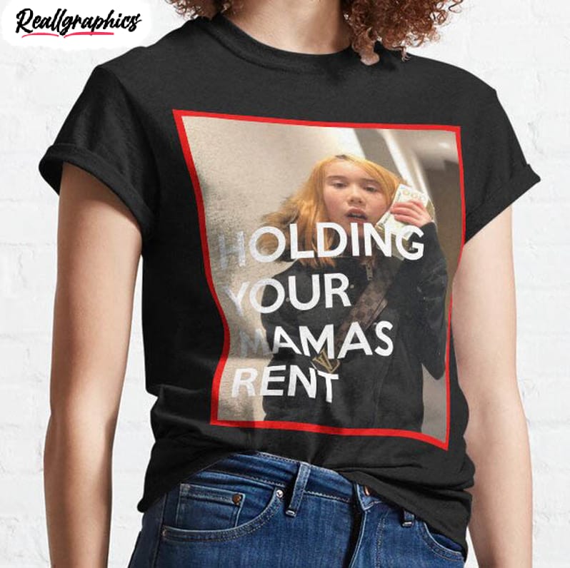 This Lil Tay long sleeve unisex t-shirt is perfect for anyone who loves rap and urban culture. The unique design features a bold and vibrant central image of Lil Tay surrounded by the words “Holding Your Mama’s Rent”, printed in a bold font. The t-shirt is made with 100% cotton for maximum comfort and durability, and it features a classic unisex fit that is roomy enough for a relaxed look. It can be worn with any kind of bottoms, and it pairs with sneakers and other hats and accessories for a complete look. The t-shirt is machine washable and available in sizes from small to XXXL. With its stylish design and long-lasting quality, this Lil Tay short sleeve unisex t-shirt is a must-have for anyone who loves rap and street style.