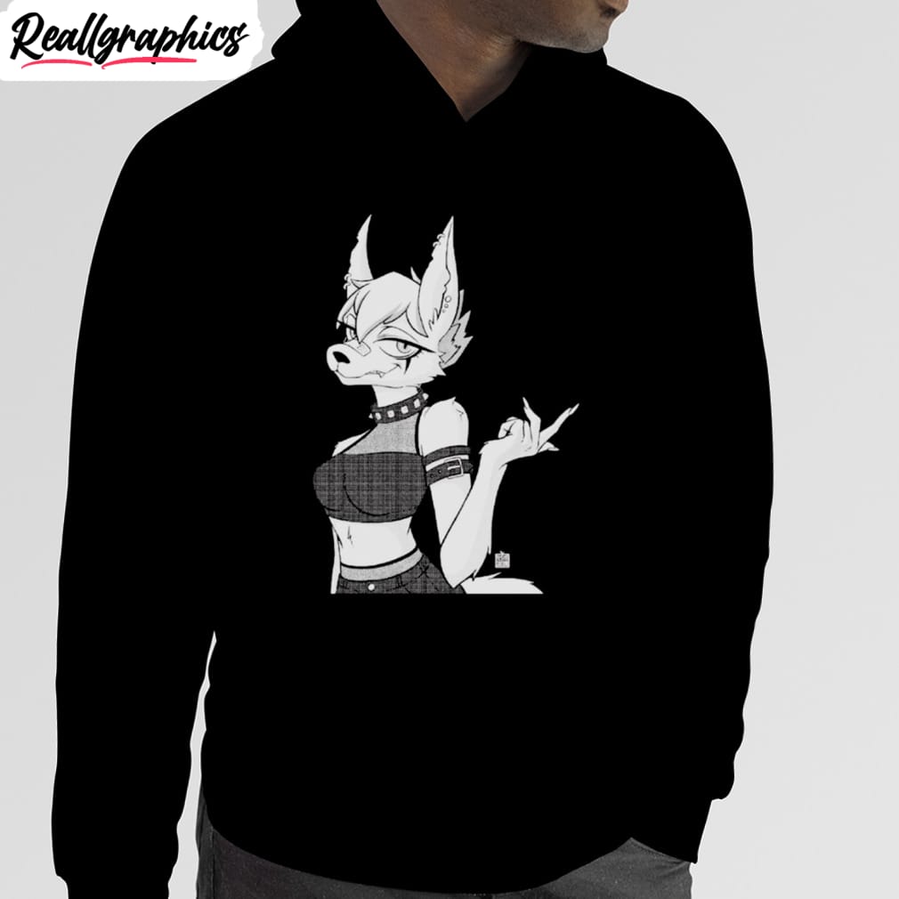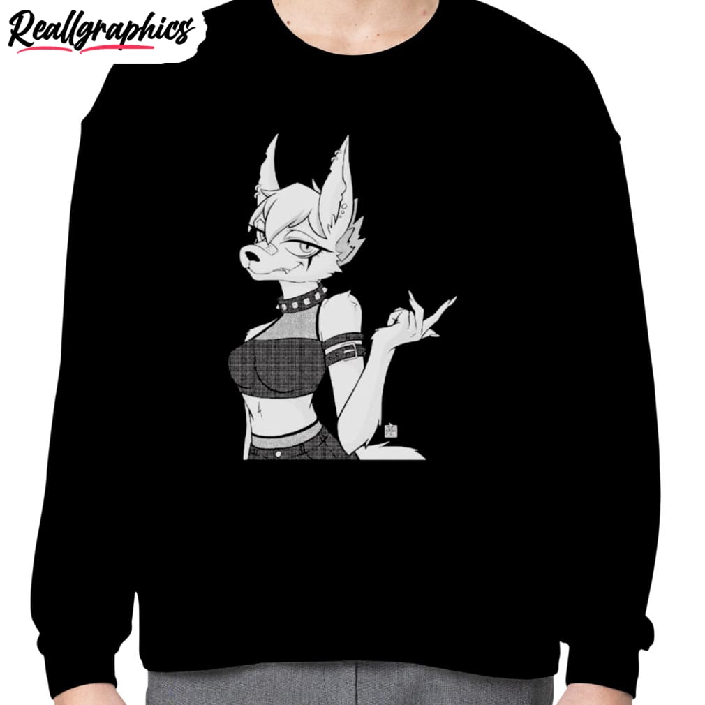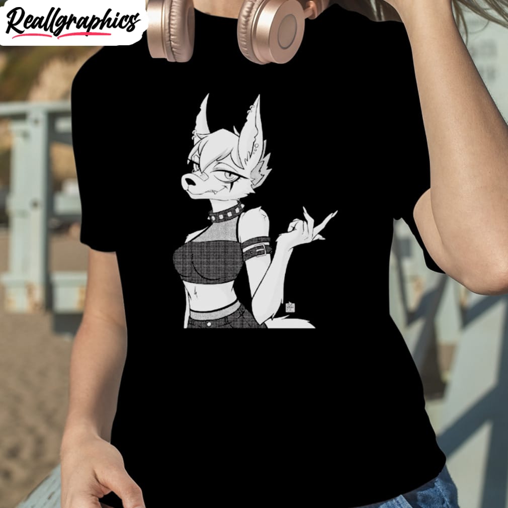 The Hottopic Punk Girl Jackal Shirt encompasses an edgy look with its bold design. Its black colouring serves as the perfect contrast to the front design, which features a detailed wolf face with punk-style accessories. Made from a soft and durable cotton blend, this shirt is both comfortable to wear and also long-lasting, making it a great choice for anyone looking to infuse a little bit of daring into their wardrobe. The grey ringer collar and sleeve cuffs add both a classic touch as well as a punk-esque vibe, while the glittery lettering on the back brings a little bit of shine to the shirt. So, the Hottopic Punk Girl Jackal shirt is for anyone looking for a bold statement piece.