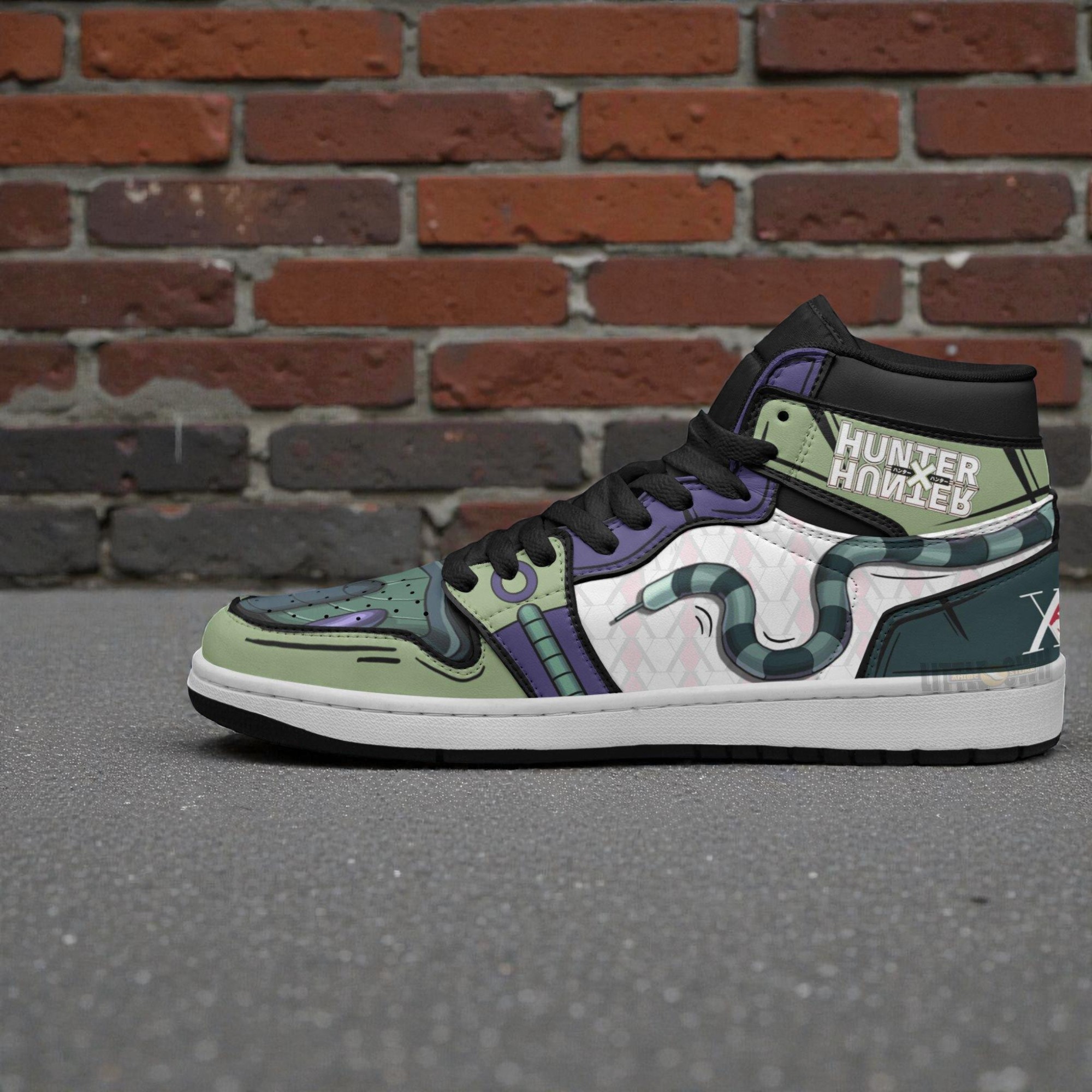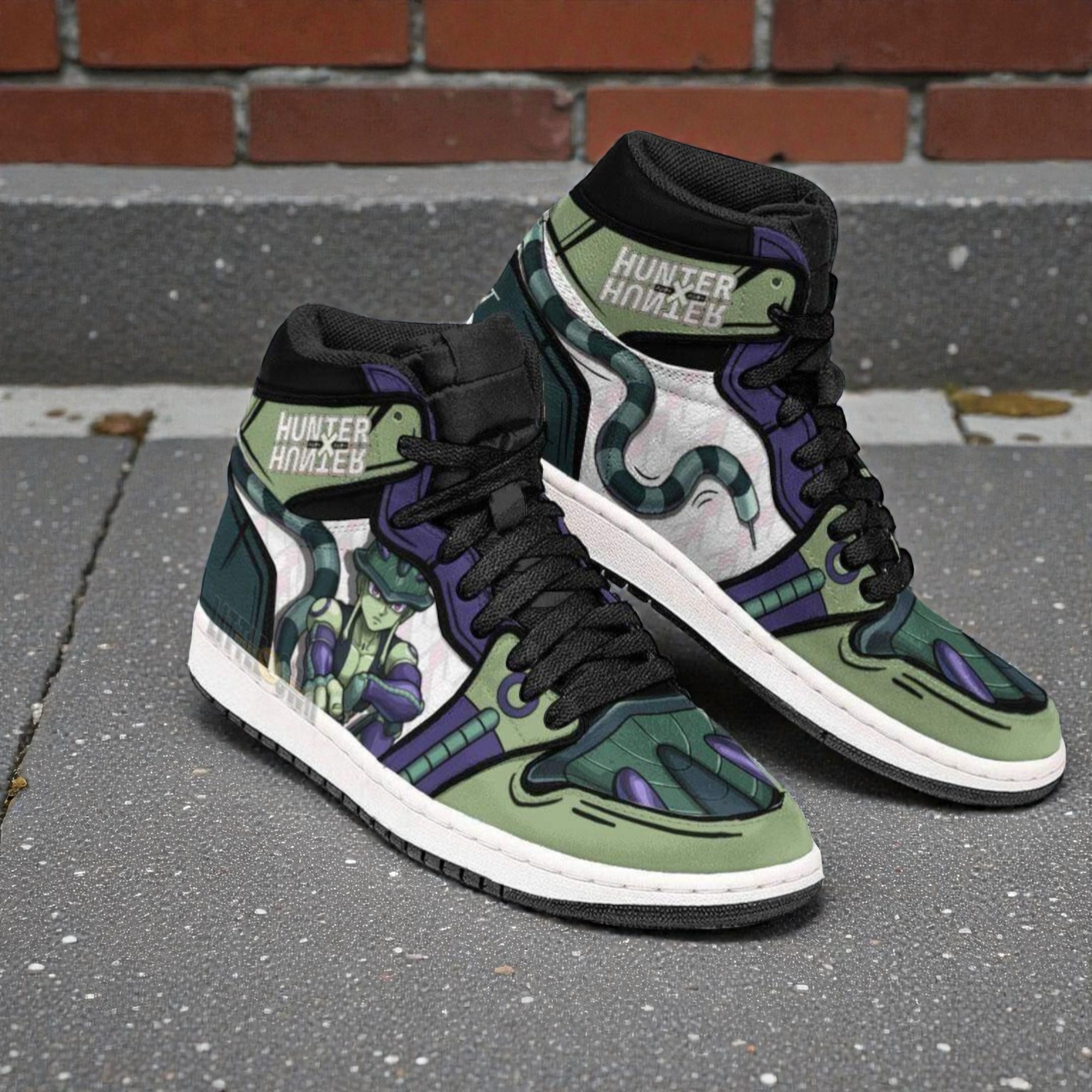 When you first catch sight of these sneakers, it’s the electric mix of colors and patterns that grabs your attention. Deep greens and purples swirl alongside crisp teals and punctuating blacks, framed by stark white accents. The design pulses with energy—like a moment frozen straight out of Hunter x Hunter’s vivid world. It’s not just a shoe; it’s a visual shout, bold and unapologetic. Look closer and the details reveal themselves. There’s a cartoon-like snake pattern weaving through the sides, sly and dynamic, reminiscent of the series’ layered complexity and danger. Hexagonal patterns add an almost futuristic edge, hinting at the strategic battles and sharp intellect that define the story. Bold outlines sharpen the imagery, while blocky, bold fonts inspired by Meruem’s threatening presence stamp the design with unmistakable personality. This is graphic streetwear with a soul, capturing both the adventure and the intensity the anime fans live for. These sneakers aren’t just footwear—they’re a statement piece for anyone who’s spent time immersed in the Hunter x Hunter universe. Whether you’re a collector who thrives on rare designs, a cosplayer putting together your next flawless look, or just someone who appreciates bold storytelling expressed through style, these are made for you. They strike that fine balance between subtle fandom and striking everyday wear. Picture slipping these on for a convention or just running through your day with a confident edge—snagged attention here and there, sparks of conversation with fellow fans, all while enjoying the comfort of something crafted with attention and respect for the source material. If gifting’s on your mind, these shoes make a thoughtful surprise, bringing a favorite anime closer to the everyday. Hunter x Hunter sneakers like these feel less like merchandise and more like a wearable homage.Hunter x Hunter Shoes Anime Sneakers Custom Boot Meruem
