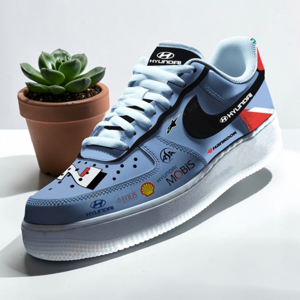 The world of rally racing carries a raw energy that’s captured not just on the track but in the gear that fans gravitate toward. The Hyundai Shell Mobis World Rally Team Special Air Force 1 Sneaker channels that energy through a striking blend of a light blue base paired with a bold black swoosh, crossing the line between performance and style. It’s a collage of carefully placed sponsor logos and racing flags that doesn’t overwhelm but instead builds a layered narrative, almost like a snapshot of the team’s identity stitched into fabric. Typography is pared down to clean, sans serif logos that anchor the design in authenticity without clutter, respecting the visual rhythm across the sneaker’s panels. The subtle plant background design softens the intensity just enough to keep the shoe from feeling purely functional, adding an unexpected contrast that hints at endurance and resilience off the asphalt. For someone who lives on the pulse of motorsport culture or collects sneakers that speak louder than a plain silhouette, this model offers both a statement piece and a wearable slice of fandom. It fits seamlessly into casual streetwear — whether thrown on for a weekend meet-up or a laid-back evening — blending everyday comfort with a nod to something more dynamic and spirited. As a gift, it’s a thoughtful choice for those who appreciate design storytelling through sport and enjoy turning their sneaker rotation into little expressions of personality.