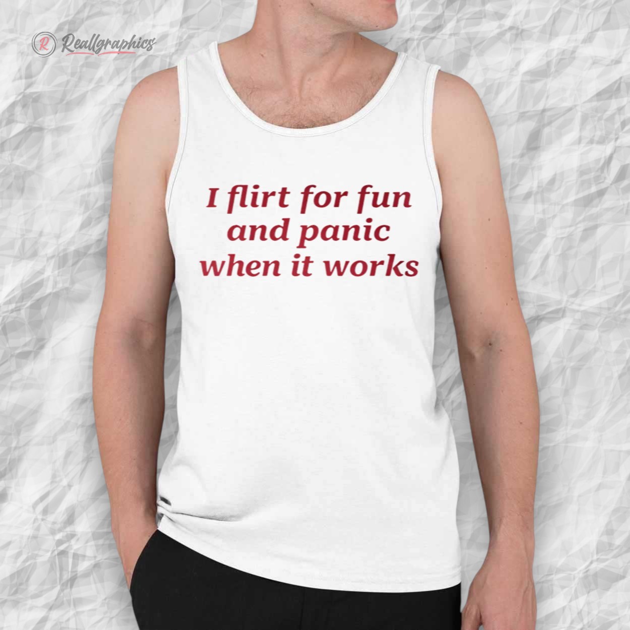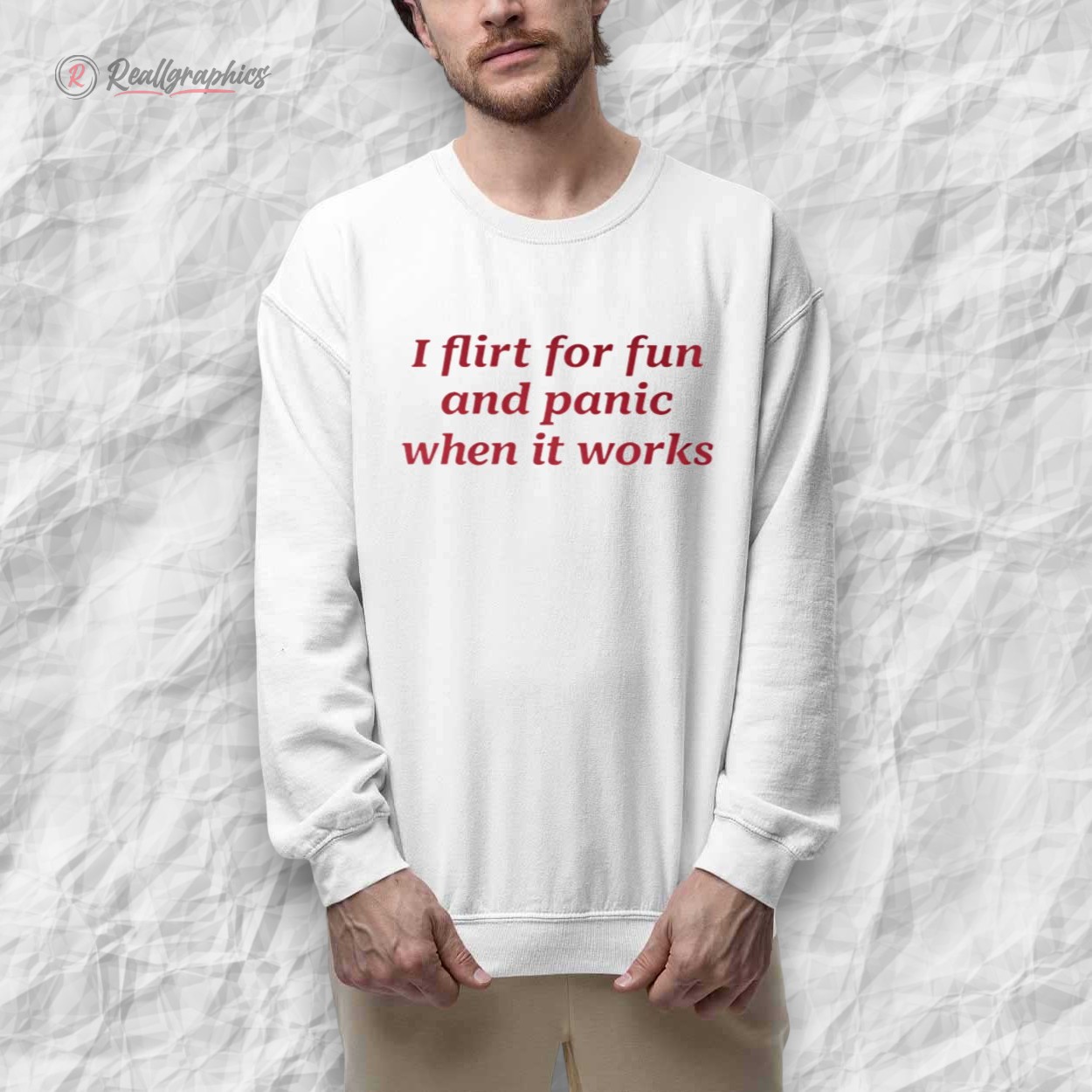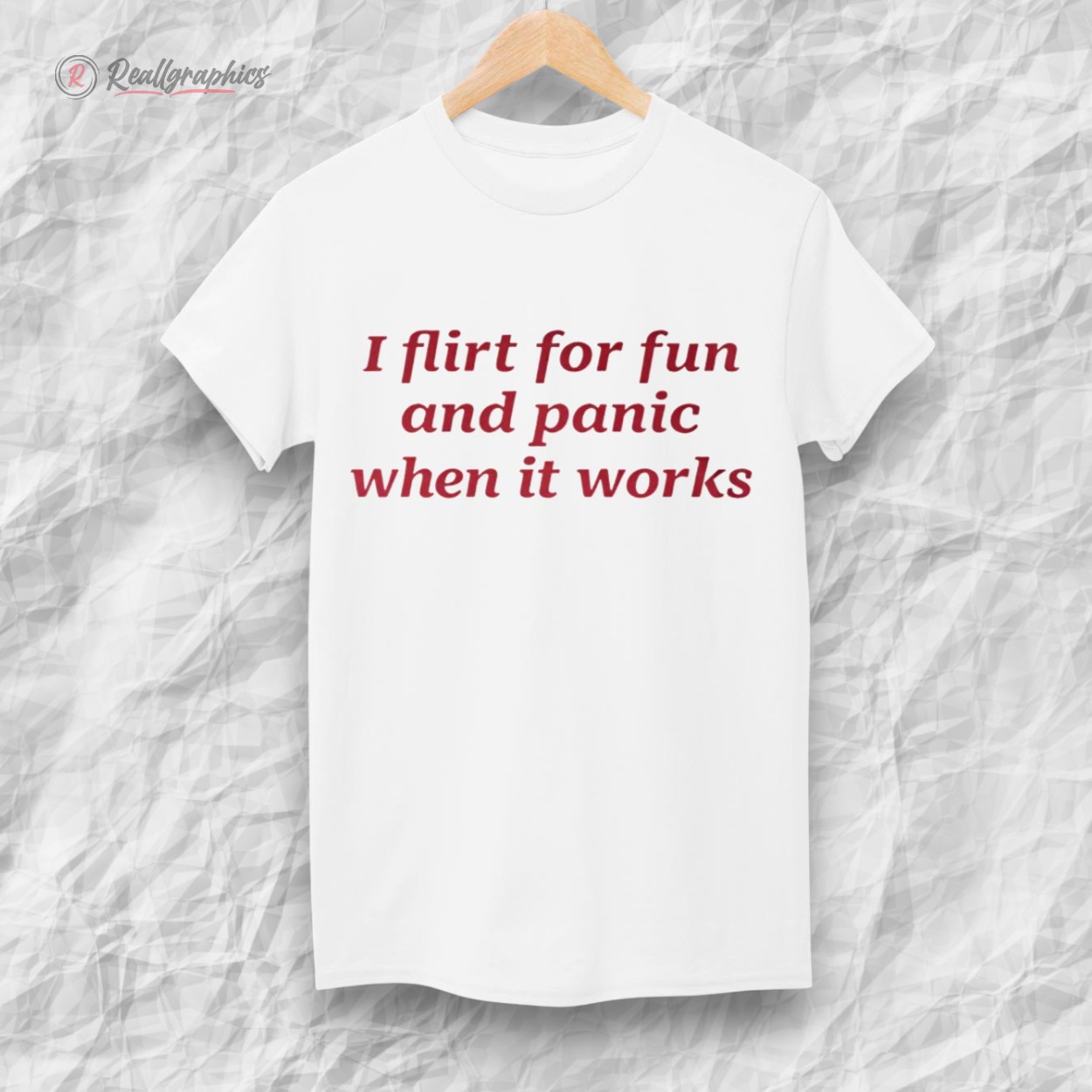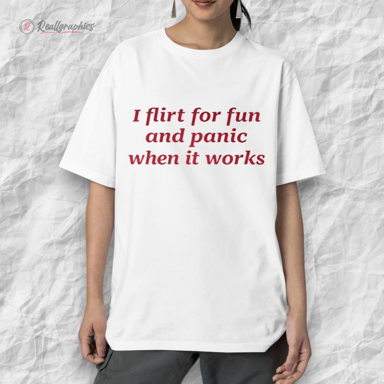 This shirt is the ultimate warning label for the chaotic flirts out there. If your dating strategy is 90% confidence and 10% pure terror when things go right, this design speaks your truth. It features the painfully honest quote: "I flirt for fun and panic when it works" in a classic, bold red serif font.