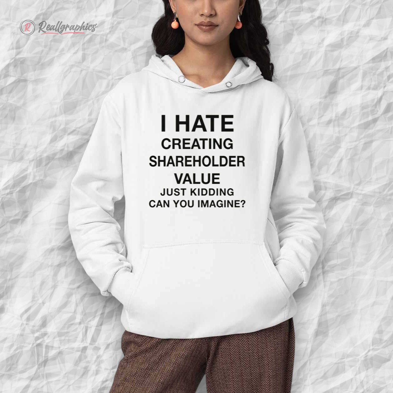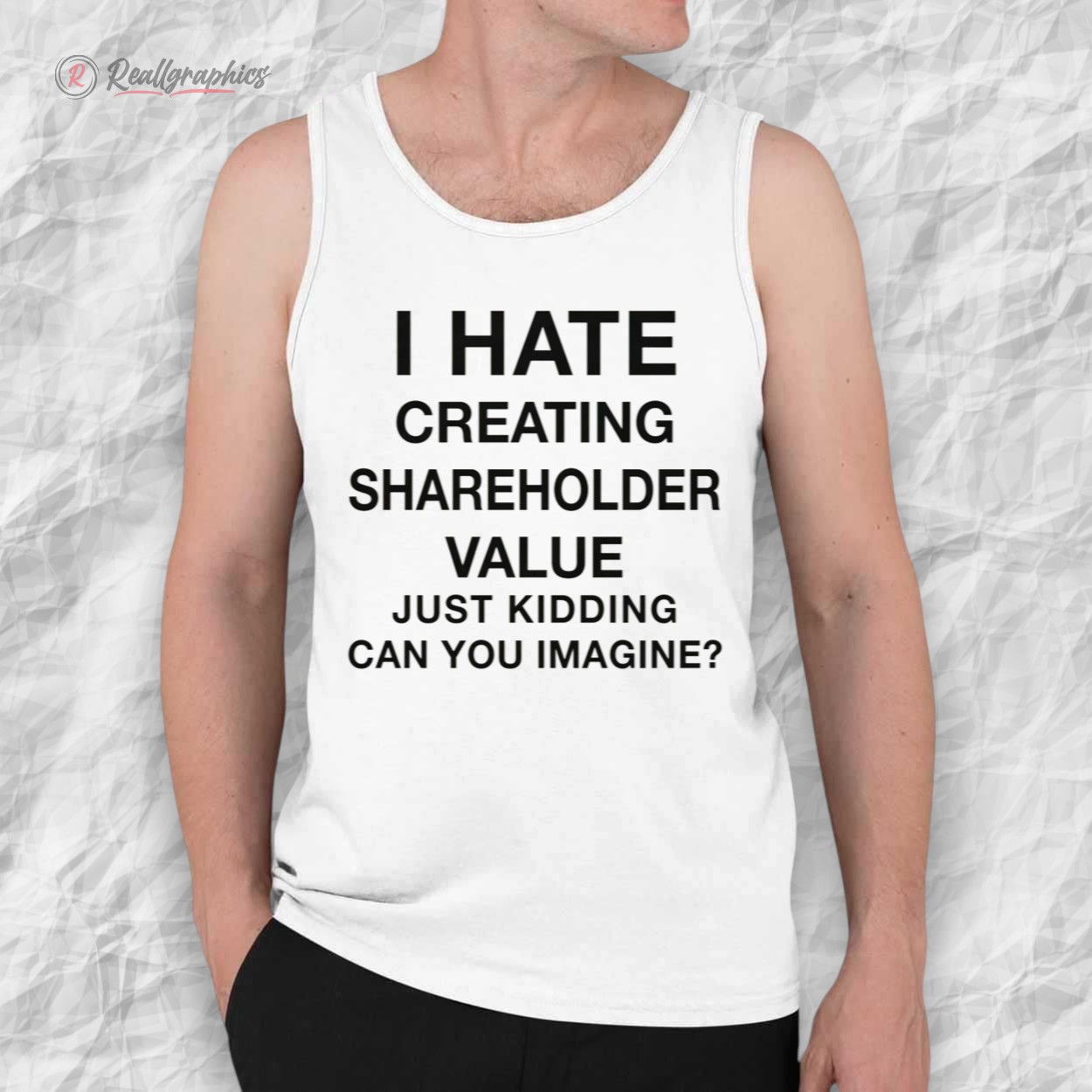 At first glance, this shirt looks like a resignation letter waiting to happen. "I HATE CREATING SHAREHOLDER VALUE." But then, the punchline hits: "JUST KIDDING CAN YOU IMAGINE?"