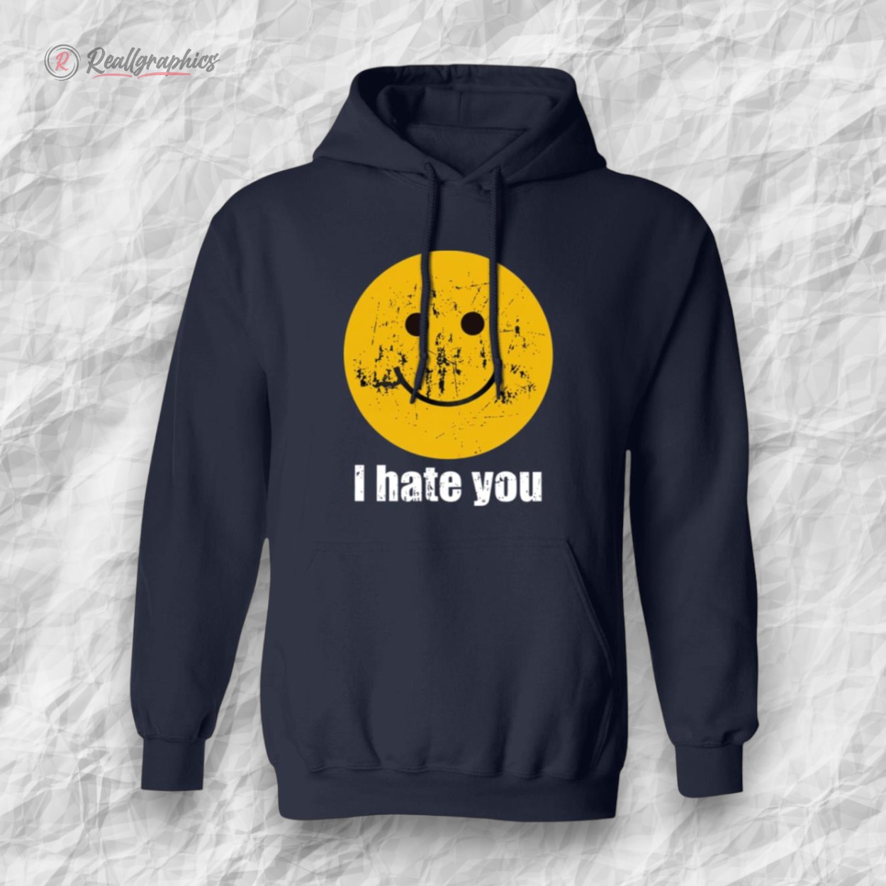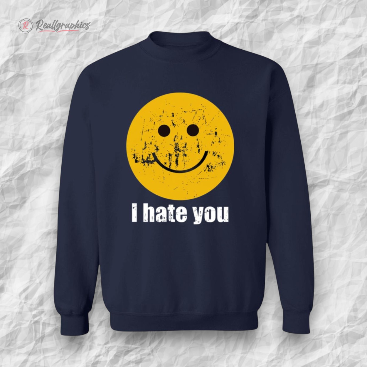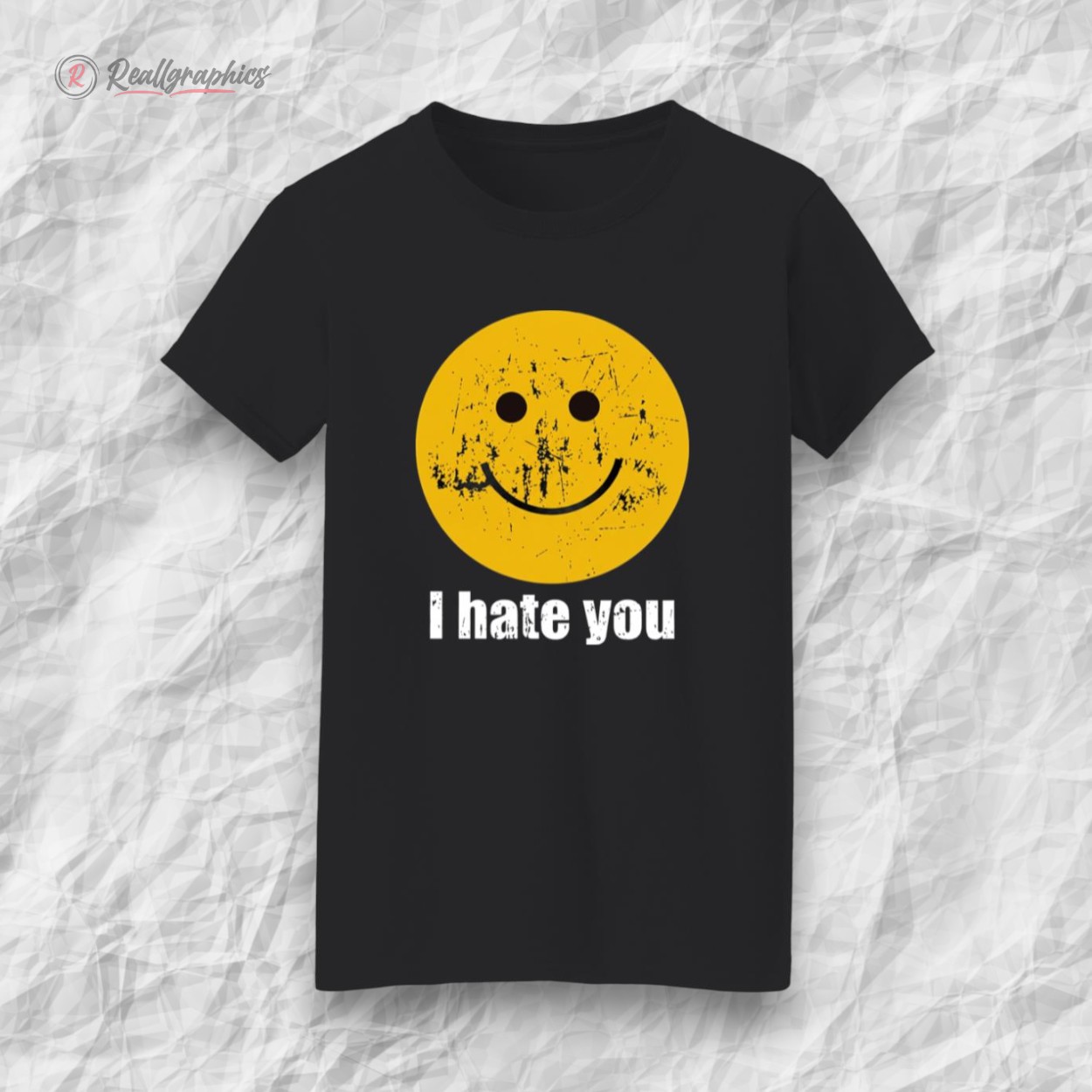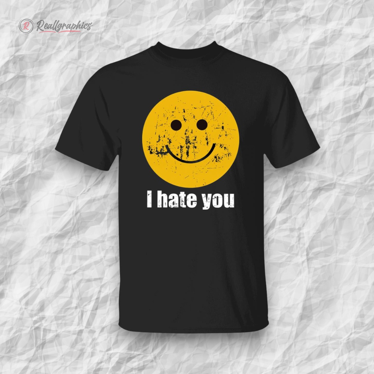 The rough edges of the yellow smiley face bleed into the black outline, as if worn down by time and attitude. The face's distressed texture gives it a grunge authenticity that feels handcrafted rather than mass-produced. Beneath the icon, the bold white text—“I hate you”—stands out in a sans-serif typeface that mirrors the roughness of the graphic, its irregular fading lending a rebellious whisper of irony. The placement centers the design perfectly on the shirt, balancing cheekiness with a raw, unpolished look. This isn’t just a shirt; it’s a declaration colored by contradiction. It speaks to those who appreciate irony wrapped in simplicity—people who understand the power of humor filtered through a darker lens. The design taps into subcultures that celebrate anti-establishment vibes and witty defiance, making it a natural fit for casual wearers who want to make a statement without saying too much. Friends with an edge—the kind who love a little sarcasm mixed with their wardrobe—will recognize the subtle, artful craftsmanship here. The distressed smiley isn’t just a graphic; it’s an attitude sketched out in fabric. Wearing an I hate you sign shirt like this blends effortlessly into everyday life, carrying a tone of playful antagonism for those moments when blunt honesty is the best expression.