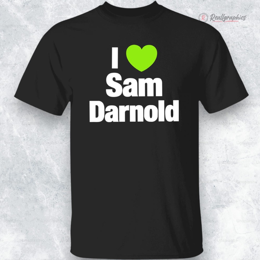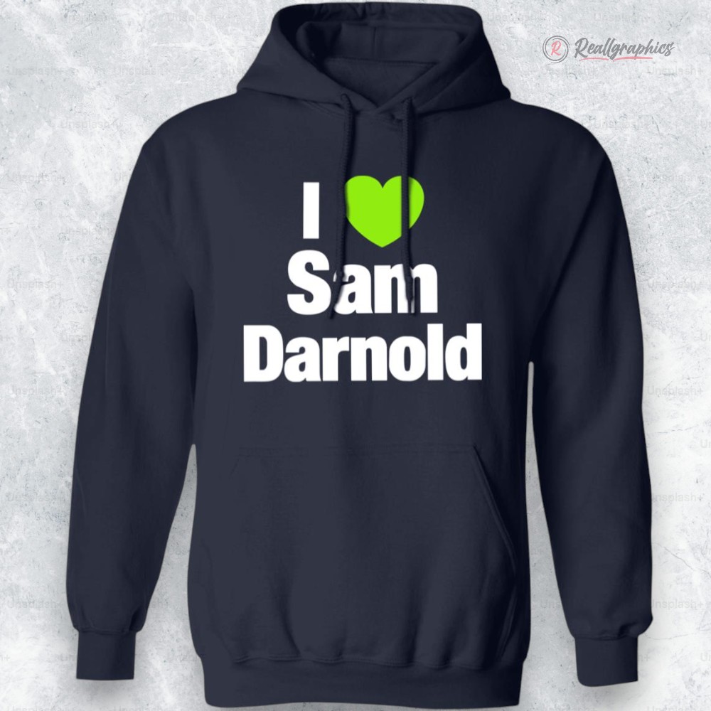 The quiet hum of anticipation fills the air, a subtle but unmistakable pulse that marks the space where fandom and fashion intersect. This navy hoodie carries more than just warmth—it embodies a bold declaration of allegiance, perfect for those who wear their passion visibly and proudly. Across the chest, blocky sans-serif letters in crisp white proclaim “I heart Sam Darnold,” punctuated by a vibrant green heart icon that slices through the composition with energy and clarity. The high-contrast typography creates a striking visual rhythm against the dark fabric, balancing athletic grit with casual ease. Wearing this design goes beyond simple support; it’s an extension of identity for Sam Darnold followers and football enthusiasts who appreciate a no-nonsense, straightforward expression of their loyalty. This is apparel for those who want to blend spirited fandom with everyday style, a garment that fits right in at impromptu game-day gatherings or relaxed weekends. The confident layout and carefully chosen colors reflect both an energetic attitude and a subtle nod to the sport’s dynamic energy. Ideal for gifting or picking up as a personal emblem of admiration, the I Love Sam Darnold hoodie resonates deeply with those who find joy in the game’s stories and players. It’s a piece that turns a simple phrase into a quiet badge of belonging, crafted with a clean, sharp design that feels as intentional as the cheers it inspires.I Heart Sam Darnold Shirt