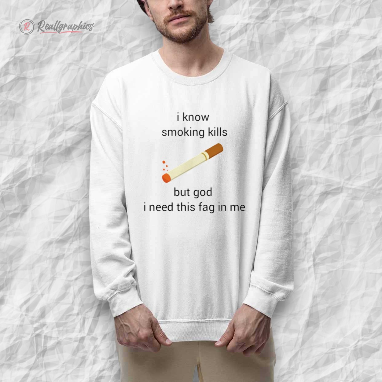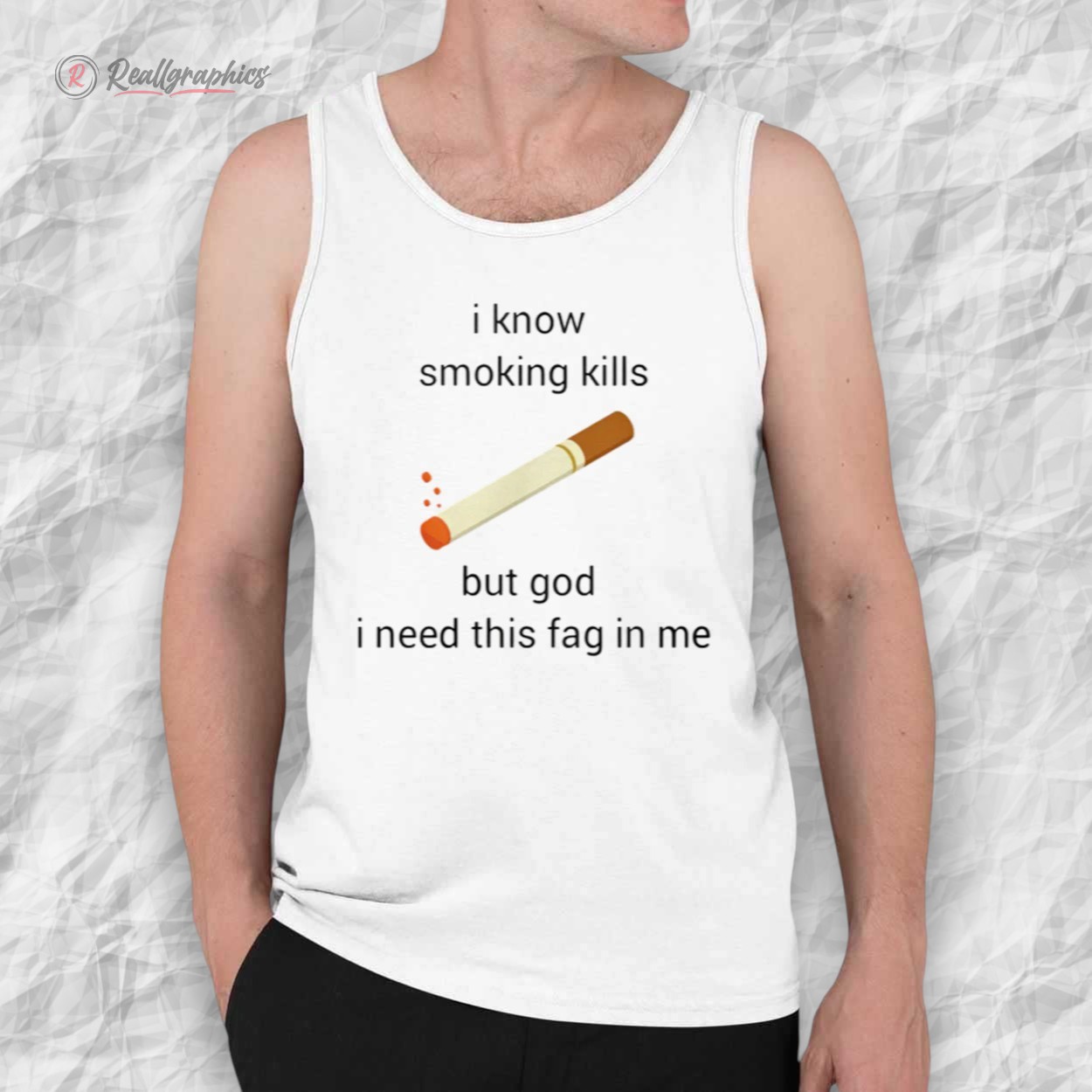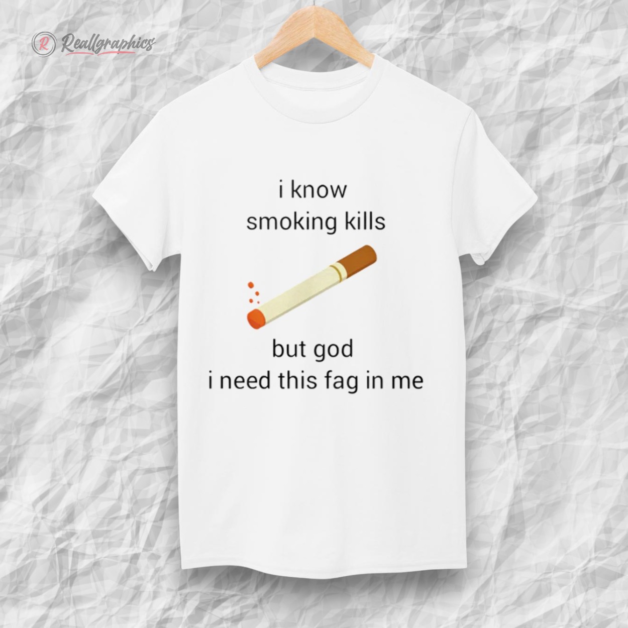 This shirt features the viral internet phrase: "i know smoking kills but god i need this fag in me" paired with a simple clip-art style cigarette. It plays on the double entendre of British slang, mixing dark humor with a "chronically online" aesthetic.