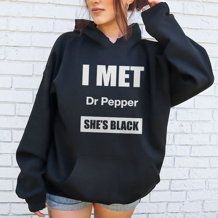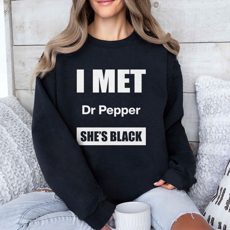 Bold white letters break through the darkness of a deep black canvas, stacked carefully in three confident lines: I MET, Dr Pepper, SHE'S BLACK. The design centers on commanding readability, using a sharp, bold sans-serif typeface that balances weight and spacing to maintain a sharp urban edge. The top and bottom lines anchor the composition with increased emphasis, creating a visual rhythm that pulls the eye up and down the statement’s provocative punch. This shirt doesn’t whisper—it declares a playful challenge, blending clever humor with a streetwear attitude. It fits perfectly into the wardrobe of someone who isn’t afraid to wear their wit on their chest and enjoys mixing sharp commentary with casual style. The graphic’s layering and the choice to isolate the famous brand name amid a stark color contrast make it more than a statement; it becomes a conversation starter. Those who appreciate graphic tees as a subtle form of rebellion or social commentary will find this especially resonant. It’s the kind of piece friends might trade knowing nods over at gatherings where edge and humor go hand in hand. Casual outings, laid-back meetups, or just an afternoon where comfort meets personality—this design moves seamlessly through those moments, echoing a confident voice without ever needing to speak aloud the full impact of the phrase, I MET Dr Pepper SHE'S BLACK.