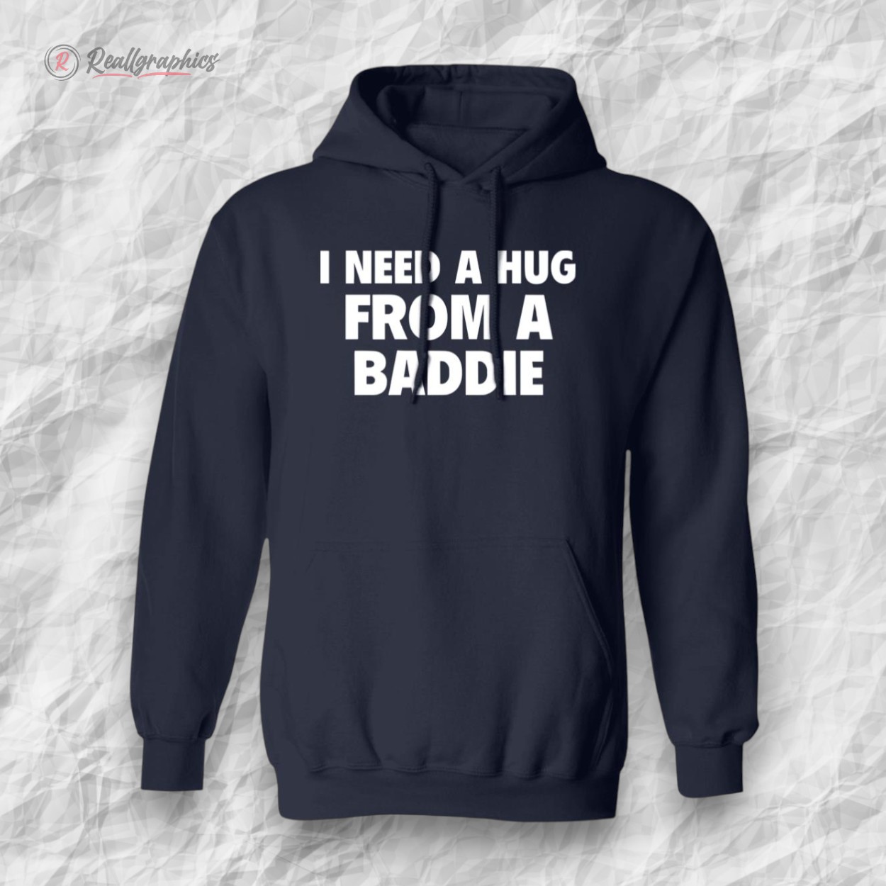 The bold white letters stand out sharply against the deep navy fabric, arranged in stacked lines that command attention without overwhelming. Each word, a confident declaration in all caps and a clean, sans-serif typeface, feels like a direct, playful challenge, the kind that invites a double take. The simplicity of the design leaves space for the message itself to shine—no frills, just an unapologetic statement across the chest. This hoodie carries a certain attitude that resonates with those who embrace their edges and aren’t afraid to blend fun with a bit of rebellion. Wearing it becomes a form of self-expression, a way to signal a mood or mindset that’s equal parts playful and assertive. It suits someone who enjoys casual streetwear but prefers their clothing to do a little more talking—especially if that talk is about owning bold feelings or a subtle call for connection. Young adults navigating laid-back days or cozy evenings will find something familiar here, whether that’s lounging with friends or gifting a little nod to a close one who exudes that same spirited energy. The phrase itself, woven into the design, hits that sweet spot between cheeky and sincere, making it less about loud declarations and more about embracing individuality with a wink. This is the kind of hoodie that gets pulled on when a day calls for comfort, confidence, and a touch of irreverence—an easy way to wear a mood without saying a word aloud.I Need A Hug From A Baddie Shirt
