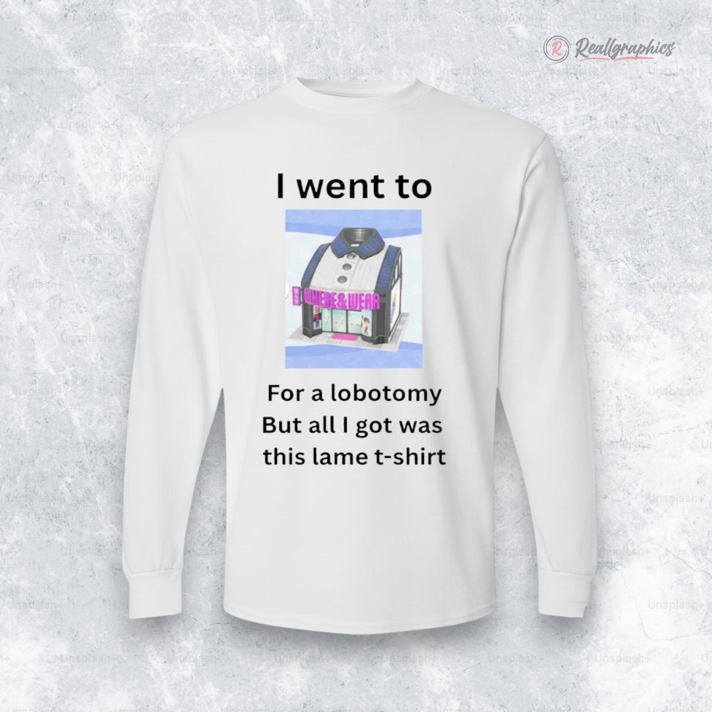 The bold colors of the boutique storefront image command attention, instantly drawing the eye to this long sleeve t-shirt. The simple sans-serif typography balances the design with clarity, using varied sizes to emphasize the humorous text above and below the central image. This interplay between bright visuals and ironic wording creates a cheeky statement, blending casual wear with meme culture in a way that’s both visually striking and deliberately silly. The design taps into a niche where humor and subtle sarcasm intersect, perfectly suited to young adults who appreciate the absurdity of internet memes. It’s not just a shirt to wear; it’s a nod to a certain irreverence that thrives in online communities, one that thrives on witty self-deprecation and unexpected punchlines. Those who gravitate toward this kind of humor will find it resonates with their personality, signaling a laid-back, novelty-loving attitude without needing to shout. Beyond the laughs, the composition itself is crafted to catch glances in everyday settings—coffee runs, casual hangouts, or low-key gatherings. The straightforward typography and vivid storefront design make it stand out without overwhelming, making the shirt an easy pick for those moments when a little bit of lame shirt humor can spark conversations or at least an amused smile. It’s the kind of casual garment that quietly celebrates the playful absurdity of life.I Went To For A Lobotomy But All I Got Was This Lame Shirt