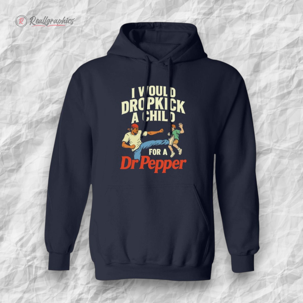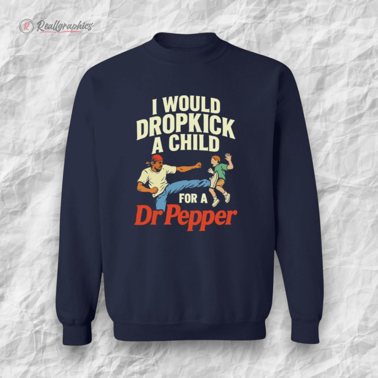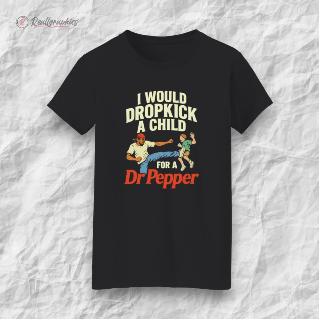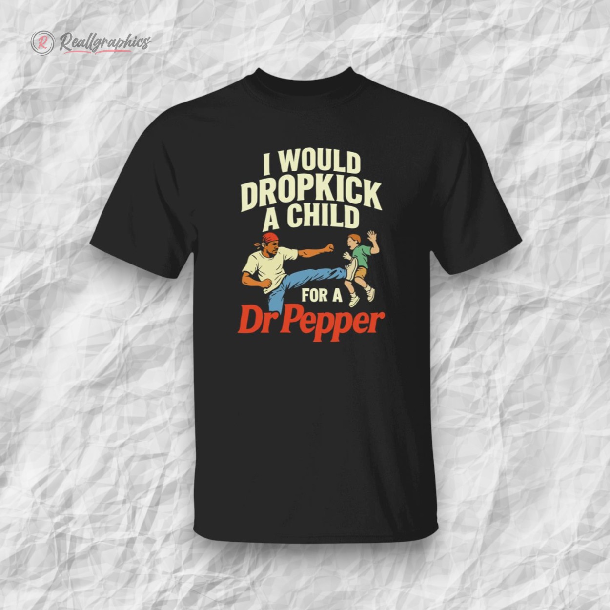 The scene unfolds with an illustrated character caught mid-dropkick, energy crackling through every line. Bold, condensed type curves above and below in a vintage display font, the phrase “I Would Dropkick A Child For A Dr Pepper” locked tight around the striking imagery. Dr Pepper’s iconic red branding punctuates the design, lending its unmistakable pop culture punch to a graphic that’s equal parts rebellious protest sign and irreverent humor. This shirt isn’t about subtlety; it’s a loud statement wrapped in retro flair for those who find delight in the provocative edge of comedy. The humor is deliberately shocking, a nod to the kind of salty wit that thrives in underground scenes or among groups of friends who appreciate irony served with a side of nostalgia. It’s the perfect rallying cry for evenings out when blending a vintage vibe with bold personality feels just right. Anyone who lives for that clash of old-school graphics and modern-day sarcasm would get a kick out of owning this. It’s a piece that resonates with the unapologetically cheeky spirit—something to wear when the goal is to turn heads, spark a smirk, or start a conversation that’s part laughter, part disbelief. This shirt fits best in the wardrobe of anyone who likes their humor a little rough around the edges, their style unmistakably their own, and their loyalty to classic sodas, well, fierce.