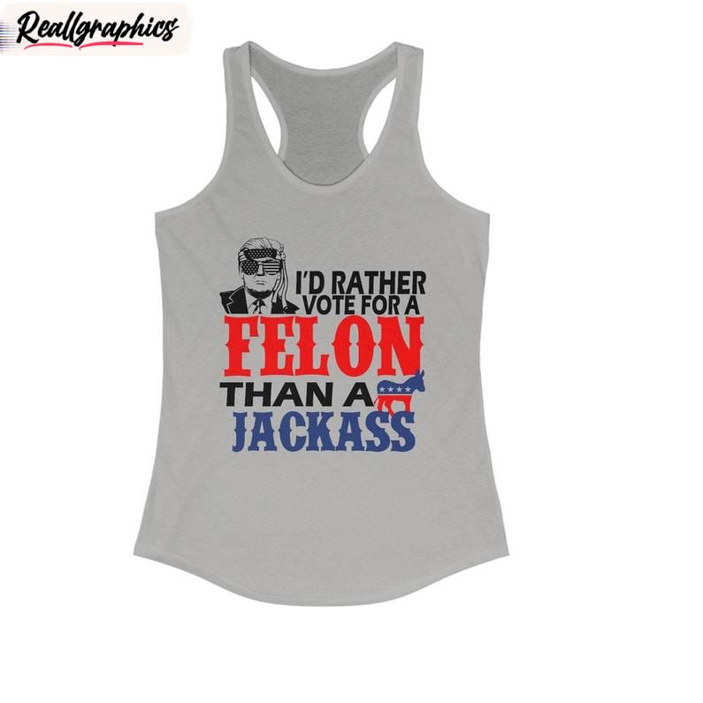 Are you tired of the same old boring political statements on your clothing? Looking for something different and bold to showcase your unique style and sense of humor? Look no further than our I'd Rather Vote For A Felon collection! With a vintage felon design and a sassy message, this unisex shirt, hoodie, and sweatshirt are sure to turn heads and spark conversations wherever you go. Make a statement and stand out from the crowd with this one-of-a-kind apparel that combines wit, style, and a touch of rebellion. So why settle for a boring jackass when you can proudly show your support for a felon?