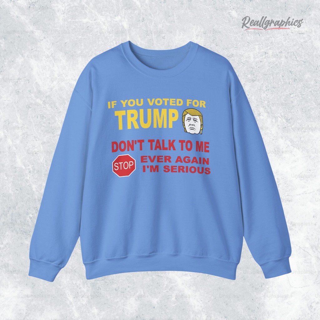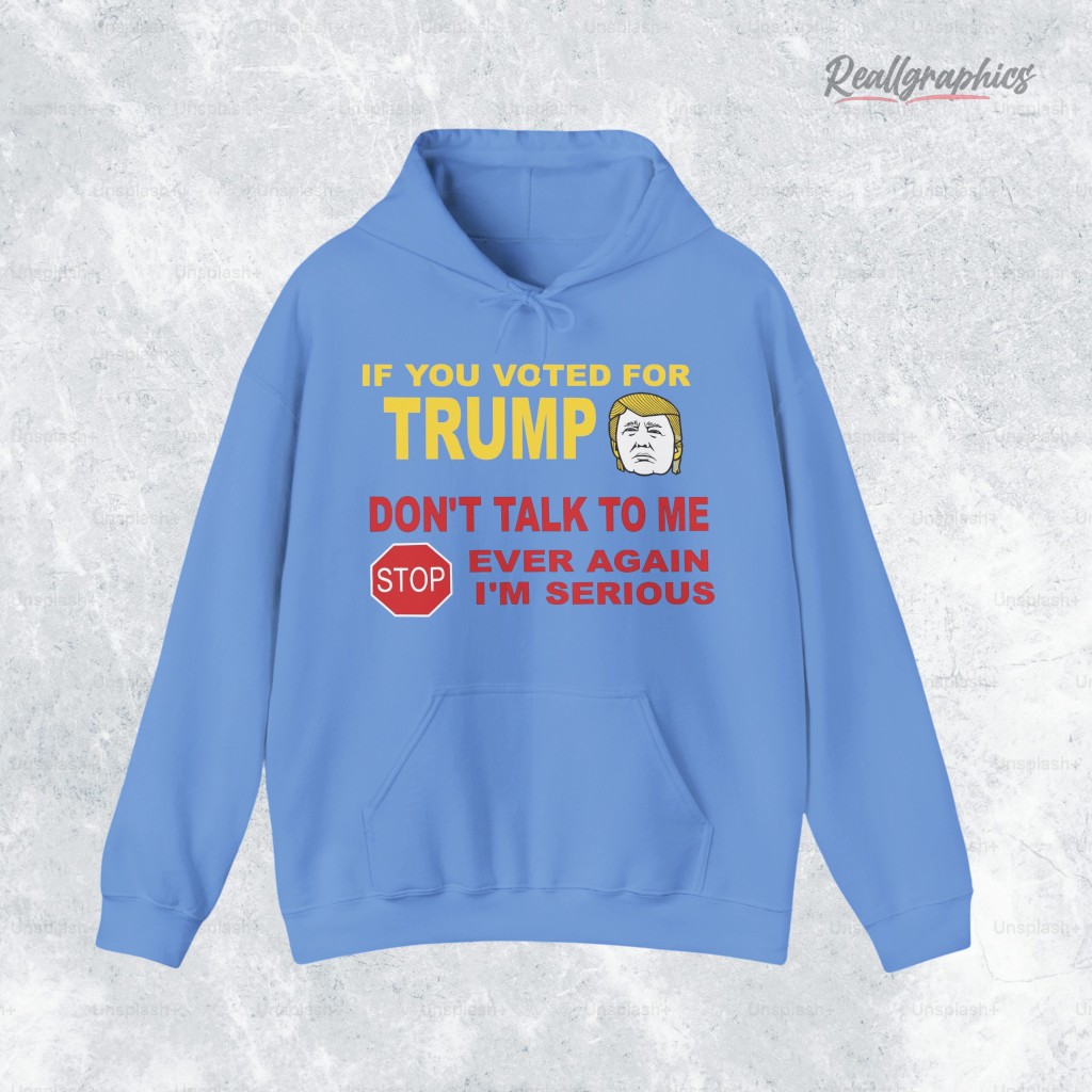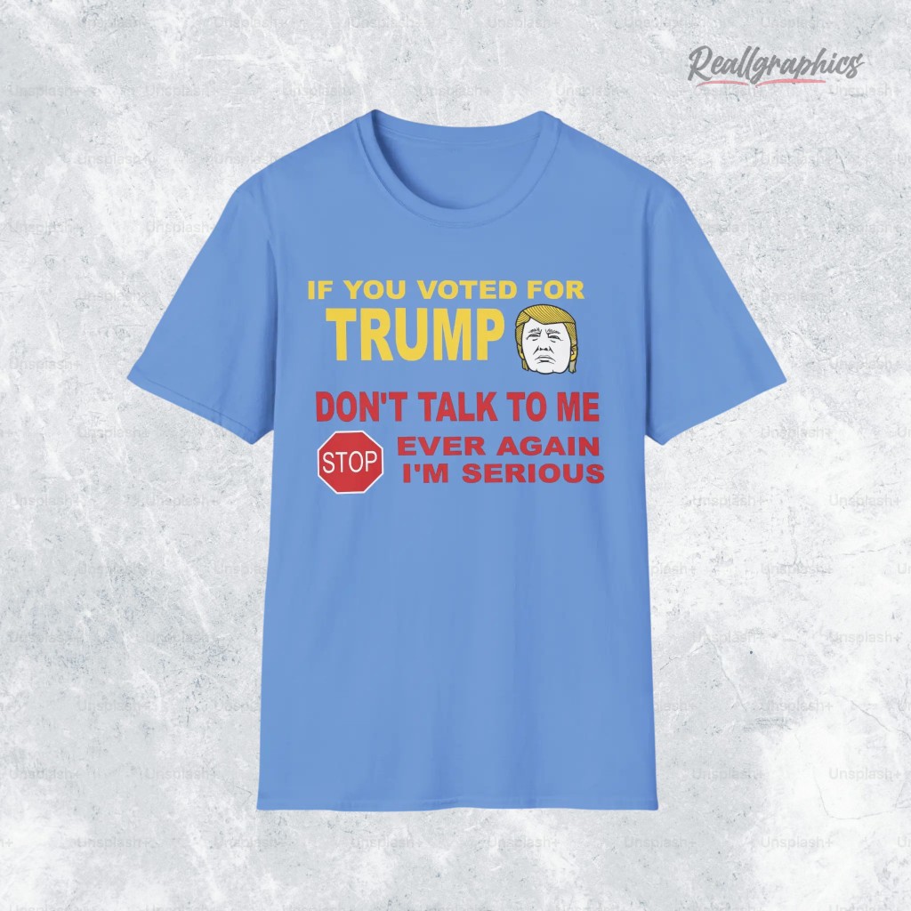 Share a bold statement with this eye-catching design featuring a playful, yet serious message. The graphic cleverly communicates a strong point of view, sparking conversation with its humorous touch. Whether you're expressing yourself at a gathering or simply enjoying a casual day out, this shirt is sure to make an impression. Ready to make your voice heard? Grab yours now and let the world know where you stand!If You Voted for Trump Shirt
