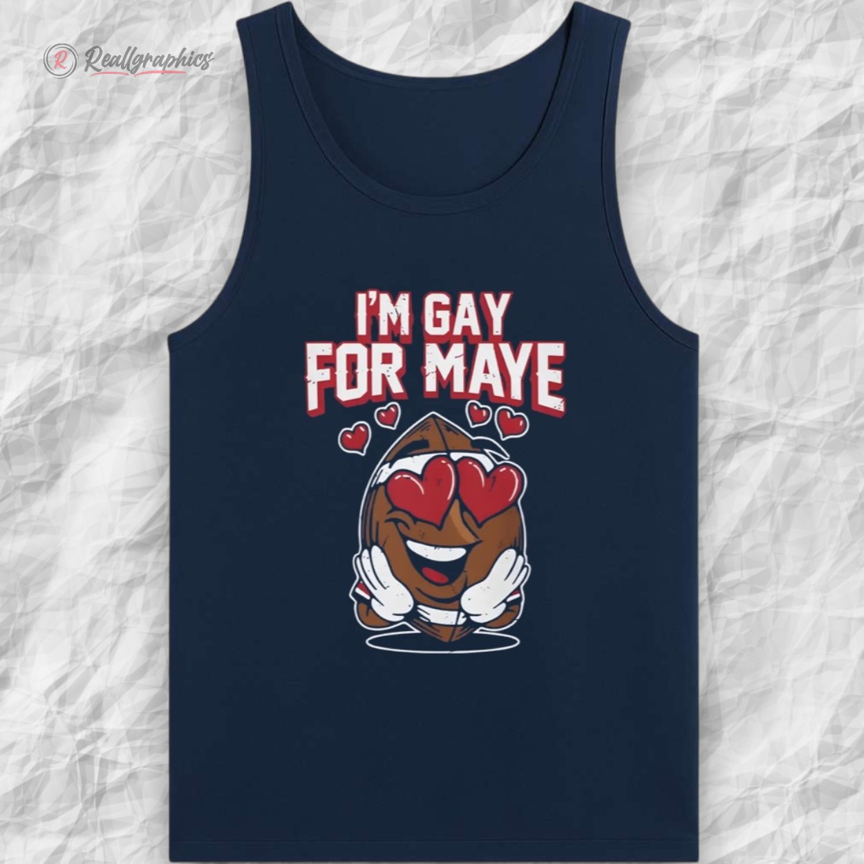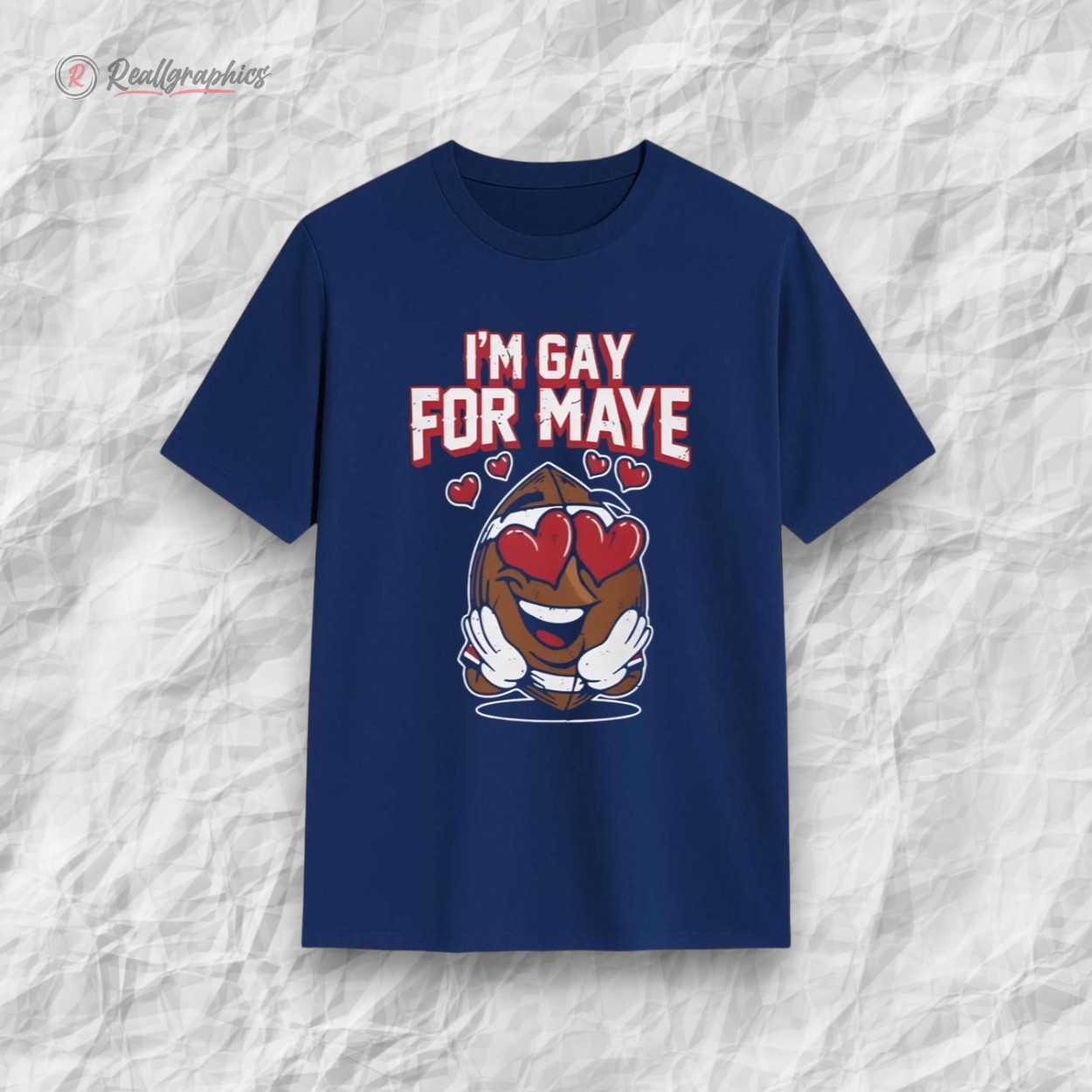 - The Design: playful "I'M GAY FOR MAYE" text with a heart-eyes football character.
