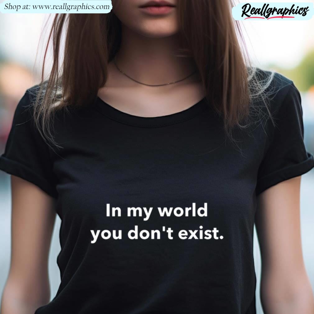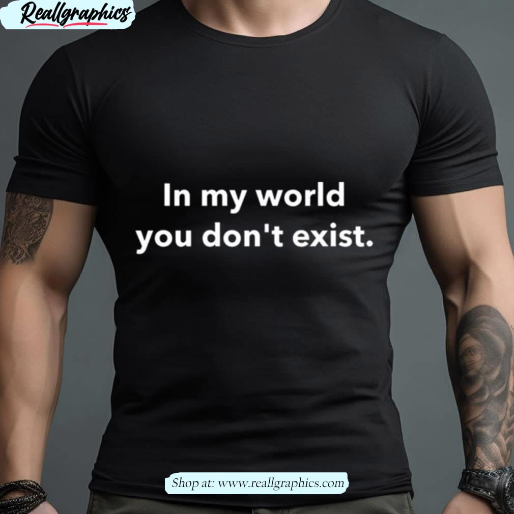 The 'In My World You Don't Exist Shirt' is a powerful statement piece that allows individuals to express their own personal space and boundaries. It serves as a reminder that in their world, certain individuals or negative energies have no place. This shirt serves as a symbol of empowerment and self-respect, helping individuals to assert themselves and prioritize their own needs and well-being. The bold design and message make a strong visual impact and can be worn as a form of self-expression and declaration of personal boundaries.