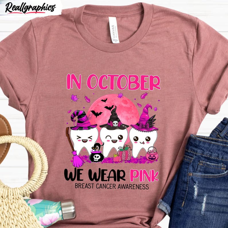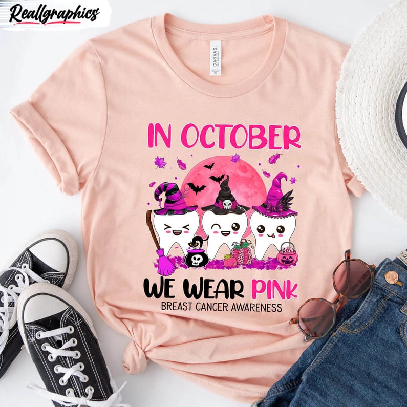The In October We Wear Pink Breast Cancer Shirt Halloween Cancer Dentist Tee Tops Long Sleeve is a stylish and meaningful piece of clothing. Perfect for the month of October, which is Breast Cancer Awareness Month, this shirt allows wearers to show their support for those battling breast cancer. The shirt features a Halloween-inspired design and is made with long sleeves, providing extra warmth during the autumn season. With its eye-catching design and important message, this shirt is a must-have for anyone looking to raise awareness about breast cancer during the month of October.