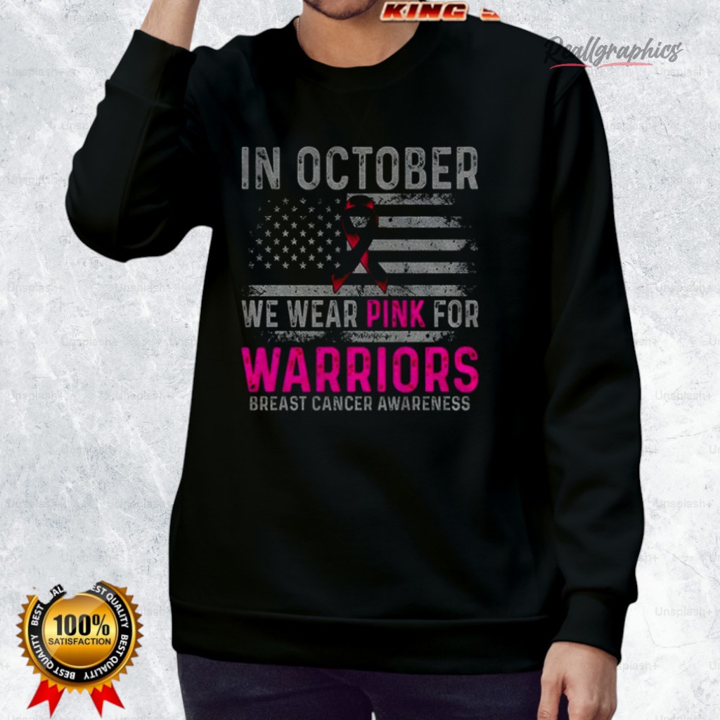 Show your support this October! ❤️ Proceeds from this special flag shirt go towards breast cancer research. Join us in honoring warriors and spreading awareness. Get yours today and make a difference! 💖 In October We Wear Pink For Warriors Flag Shirt