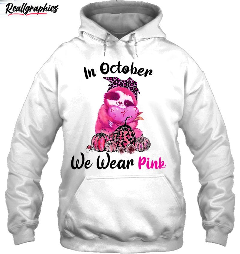 The In October We Wear Pink Sloth Breast Cancer Halloween Tee Shirt is a trendy and meaningful shirt that is perfect for the month of October. This shirt features a cute sloth design, wearing a pink ribbon as a symbol of breast cancer awareness. The shirt is designed to be worn during the Halloween season, making it a fun and stylish way to show support for breast cancer patients and survivors. The shirt is made of comfortable and high-quality materials, ensuring both style and comfort while wearing it. Additionally, a portion of the proceeds from each shirt sold goes towards breast cancer research and support organizations.