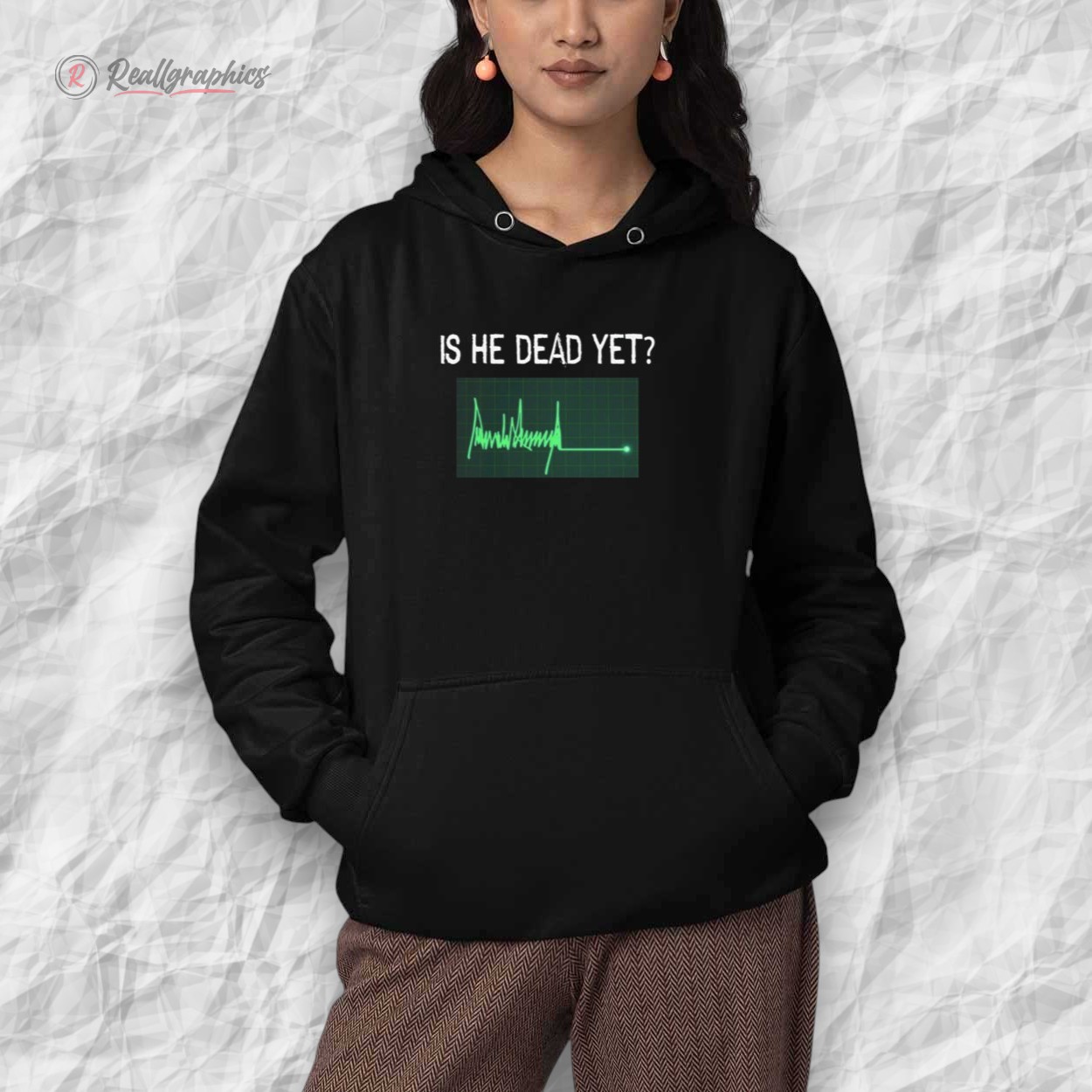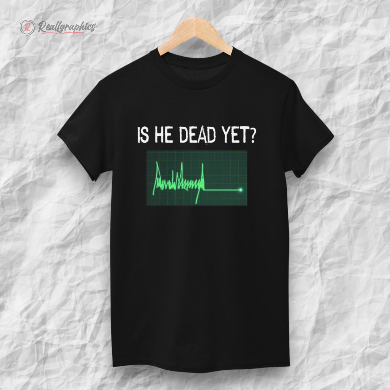 This shirt delivers the ultimate dark humor punchline. It features the blunt question "IS HE DEAD YET?" sitting above a green medical EKG monitor that has officially gone flat. It is final, it is morbid, and it captures a very specific feeling of anticipation.