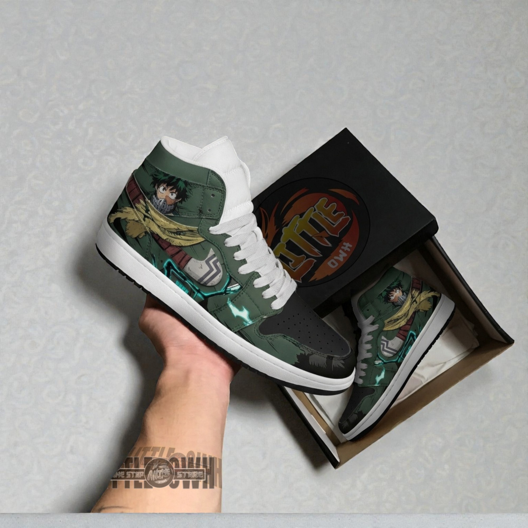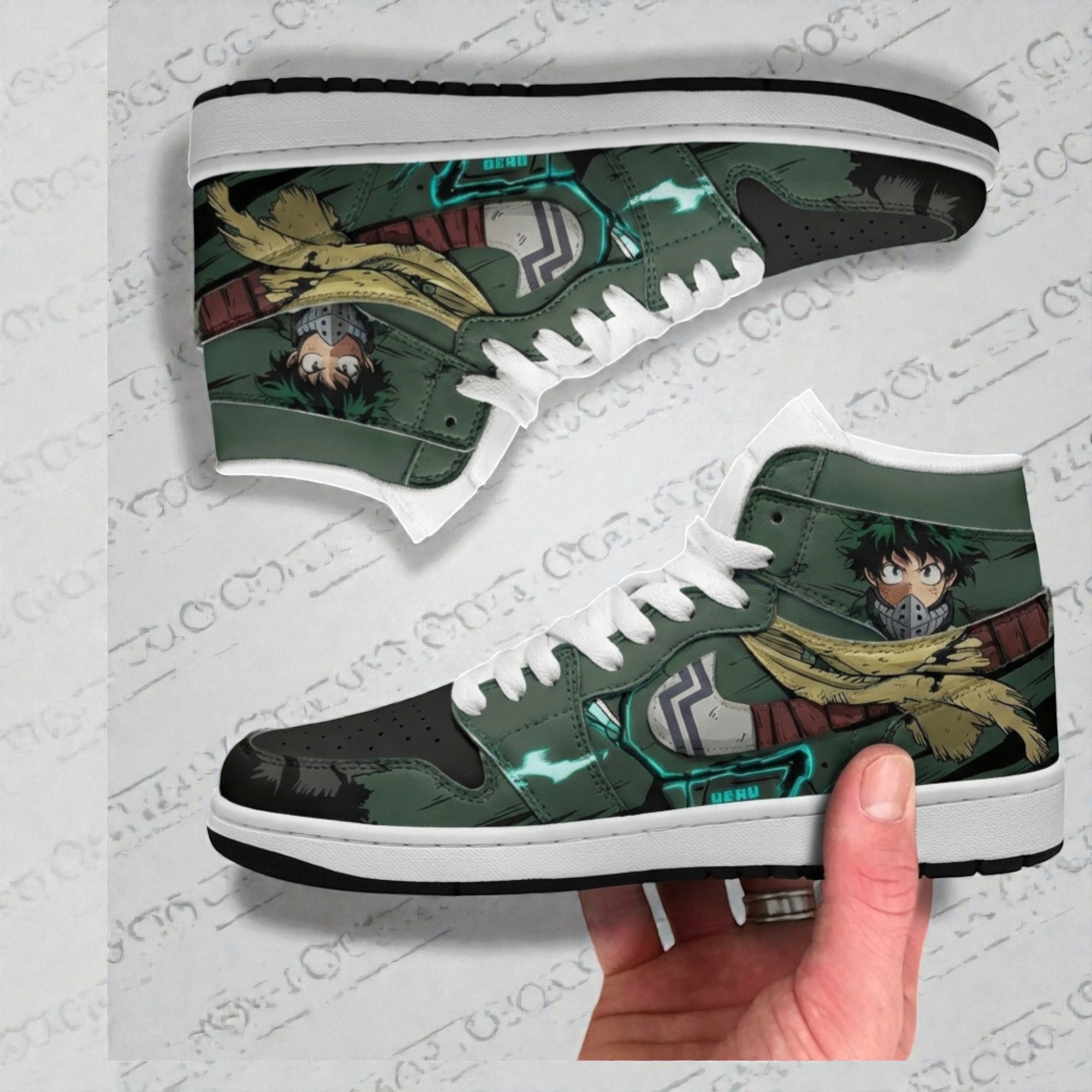 Green camouflage tones wash over the canvas of these sneakers, punctuated by crisp white laces that sharpen the overall look. Illustrations of Izuku Midoriya wrap around the shoe, capturing the energetic, heroic spirit that defines the character. The graphic elements don’t just sit on the surface—they feel alive, lending a bold streetwear edge that resonates with anyone deeply connected to My Hero Academia’s world. Every panel draws you closer to the heart of the series, reflecting Midoriya’s determination and growth. This sense of motion and resolve isn’t just for show; it’s a nod to the kind of fan who wears their passion with an understated confidence. Not overly flashy, but undeniably unique, these sneakers fit comfortably into conventions and casual outings alike, making them a natural choice for those who want to carry a piece of the story beyond the screen. Sneaker enthusiasts who appreciate a mix of art and function will find the Izuku Midoriya sneakers especially compelling. They speak to a community that values character-driven design and the quiet heroism that Midoriya embodies. Whether tucked under jeans on a walk through a city or paired with a cosplay outfit at a gathering, these shoes carry a cultural heartbeat that’s hard to ignore.