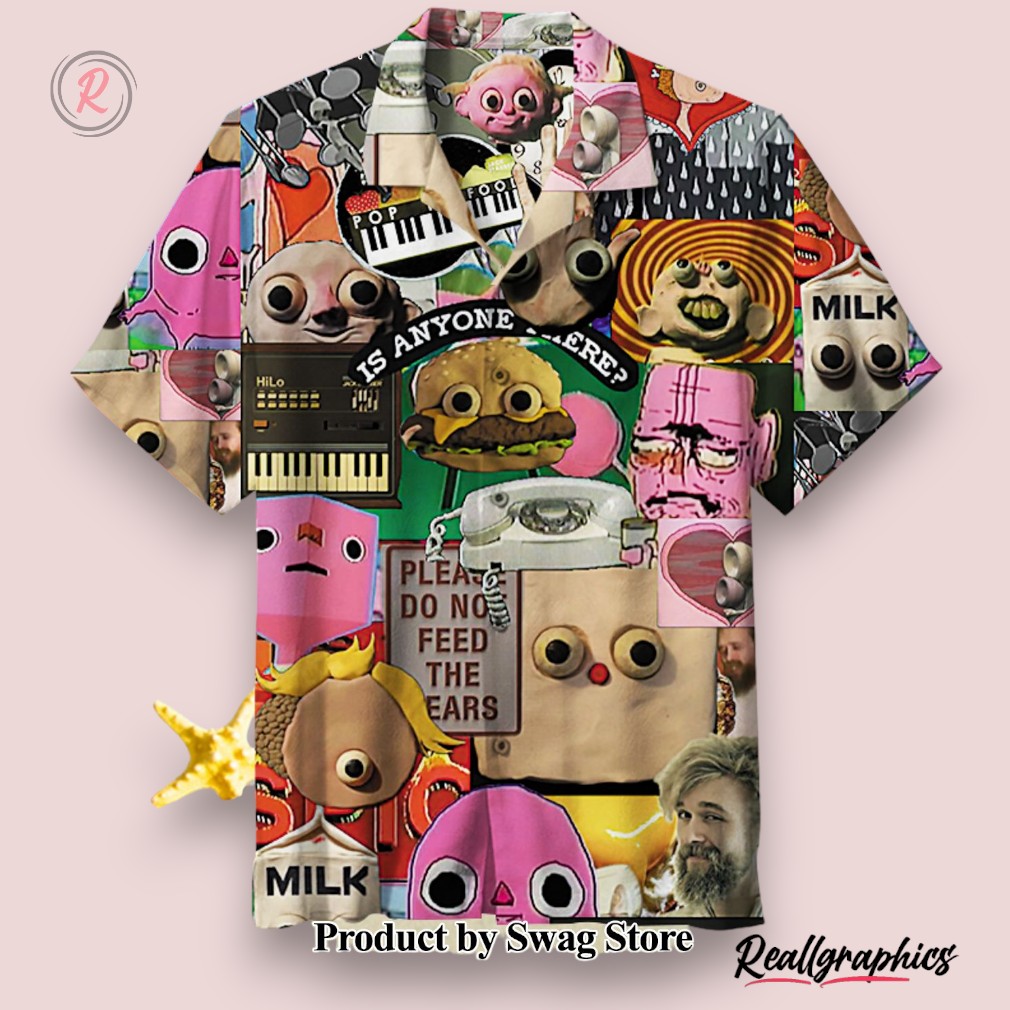 Step into paradise with this vibrant and unique Hawaiian shirt that is sure to make a statement wherever you go. Featuring the whimsical and captivating photographic prints by acclaimed artist Jack Stauber, this piece is a true work of art. Get ready to stand out from the crowd and express your individuality with this eye-catching and versatile shirt that combines style with comfort. Perfect for any occasion, this Hawaiian shirt is a must-have for anyone looking to add a touch of fun and creativity to their wardrobe.Jack Stauber Photographic Print Hawaiian Shirt