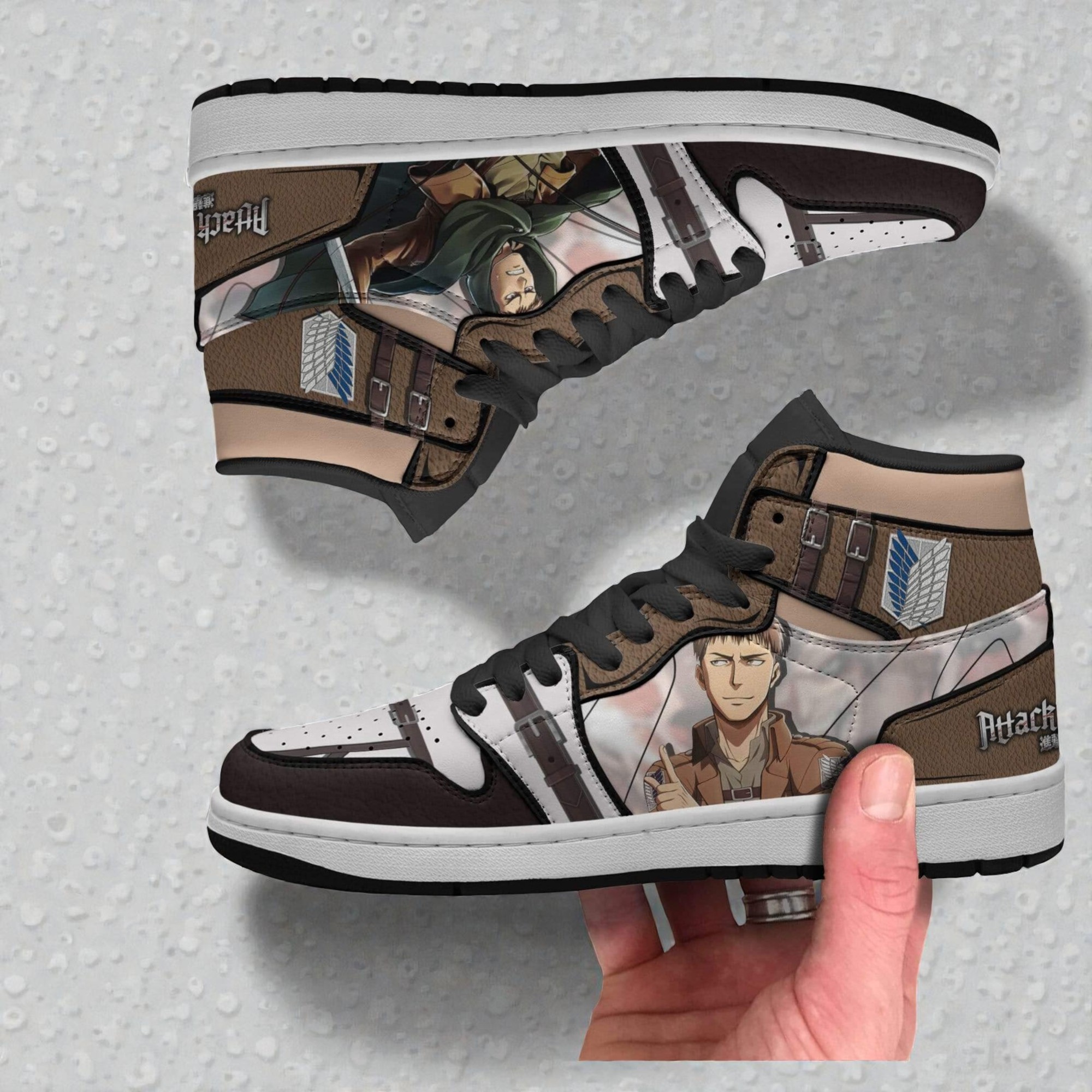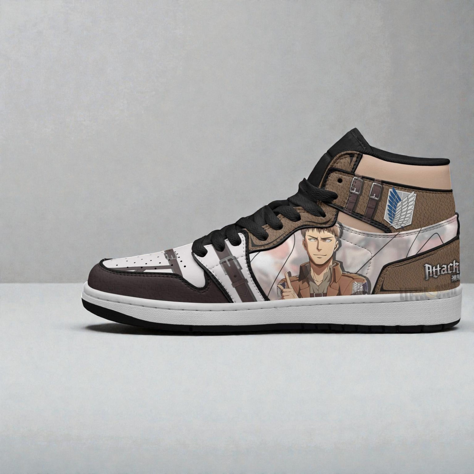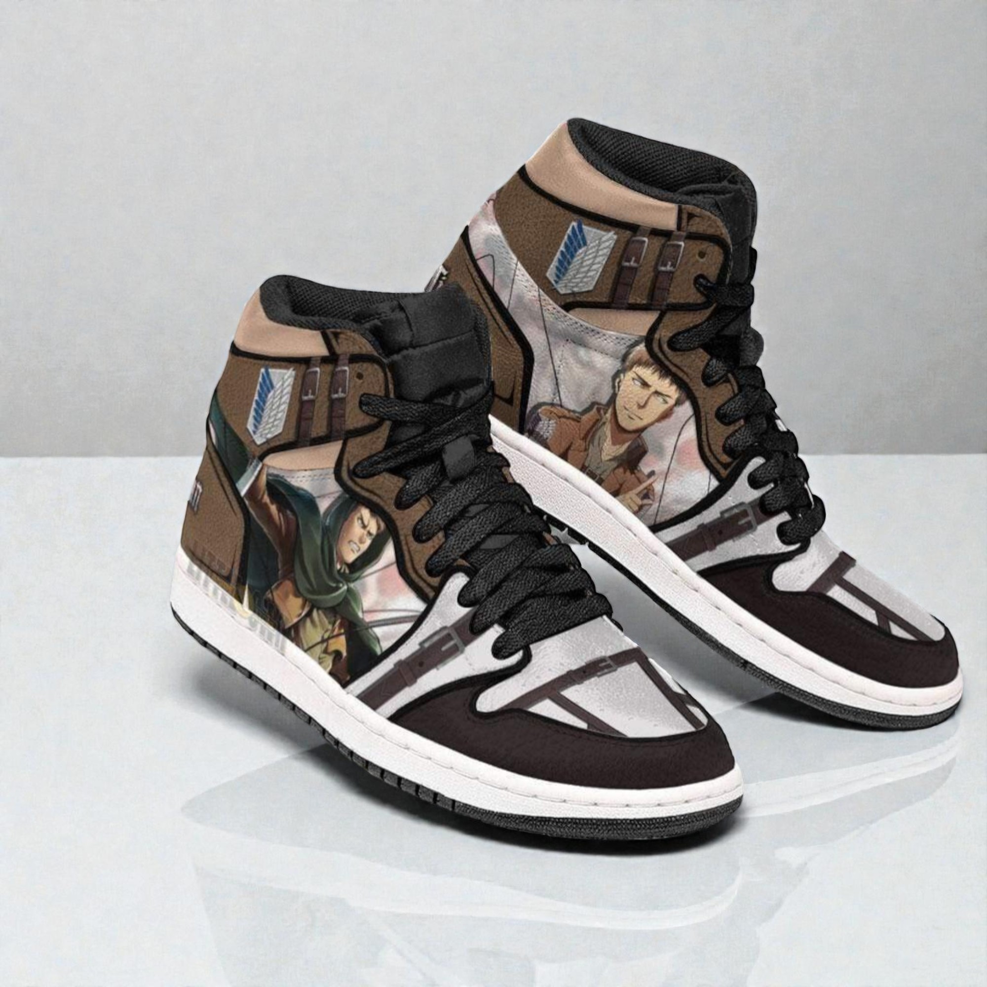 The way the boot sneakers blend rich browns and crisp whites immediately catches the eye, setting a tone that’s both grounded and dynamic. Illustrated scenes from Attack on Titan wrap around the shoe, bringing a cinematic energy that feels bold without being over the top. Among the details, Jean Kirstein’s focused expression pairs seamlessly with the iconic Survey Corps insignia, grounding the design firmly in the series' spirit of perseverance and courage. Fans familiar with the intense, adventurous world of Attack on Titan will recognize more than just familiar faces here. These sneakers seem to embody the grit and determination of the characters, making them more than just footwear—they’re a statement for anyone who connects deeply with the anime’s themes of survival and defiance. The boot silhouette adds a rugged edge, balancing the graphic elements with a practical style that fits well in everyday wear or at conventions where subtle nods to fandom feel meaningful. For someone looking to celebrate their love for the series or searching for a thoughtful gift for an anime enthusiast, these Attack on Titan sneakers capture a mix of visual drama and personal connection. They’re a nod to shared stories and a lifestyle that embraces both bold visuals and comfort, perfect for casual outings or standing out at fan gatherings.
