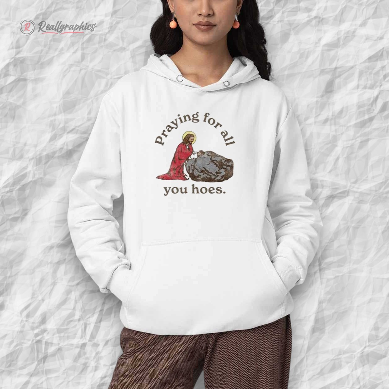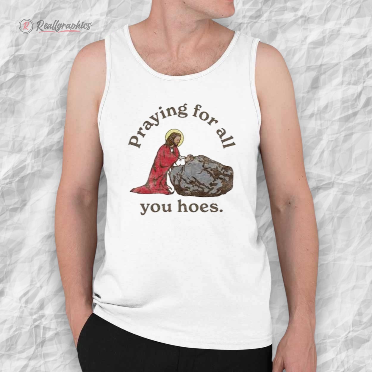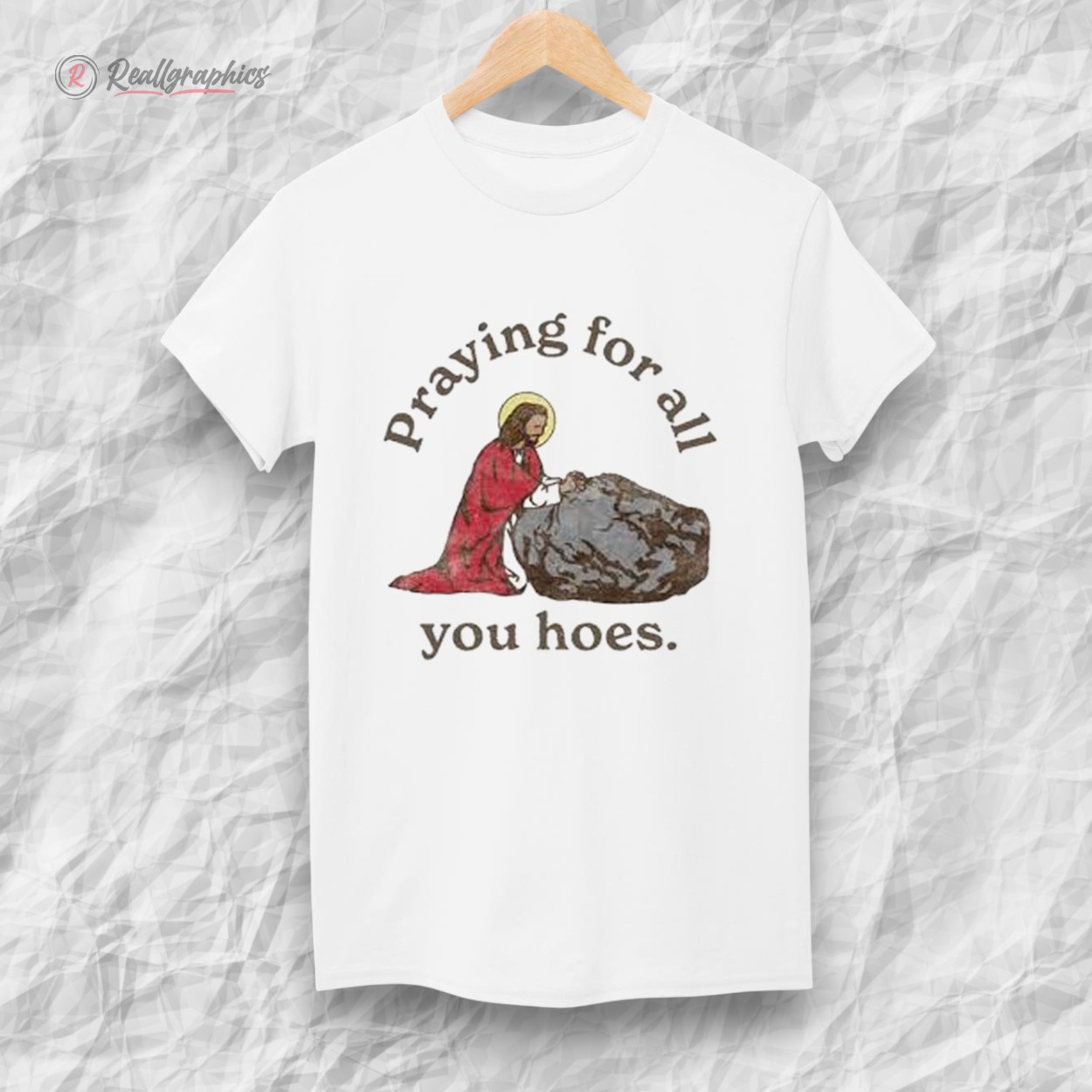 Elevate your wardrobe with this cheeky, faith-inspired shirt that's equal parts humor and heart. Picture Jesus kneeling in quiet devotion before a rugged boulder, halo glowing, with the bold declaration "Praying for all you hoes." It's a witty twist on redemption and resilience, perfect for those who appreciate irreverent takes on classic icons.