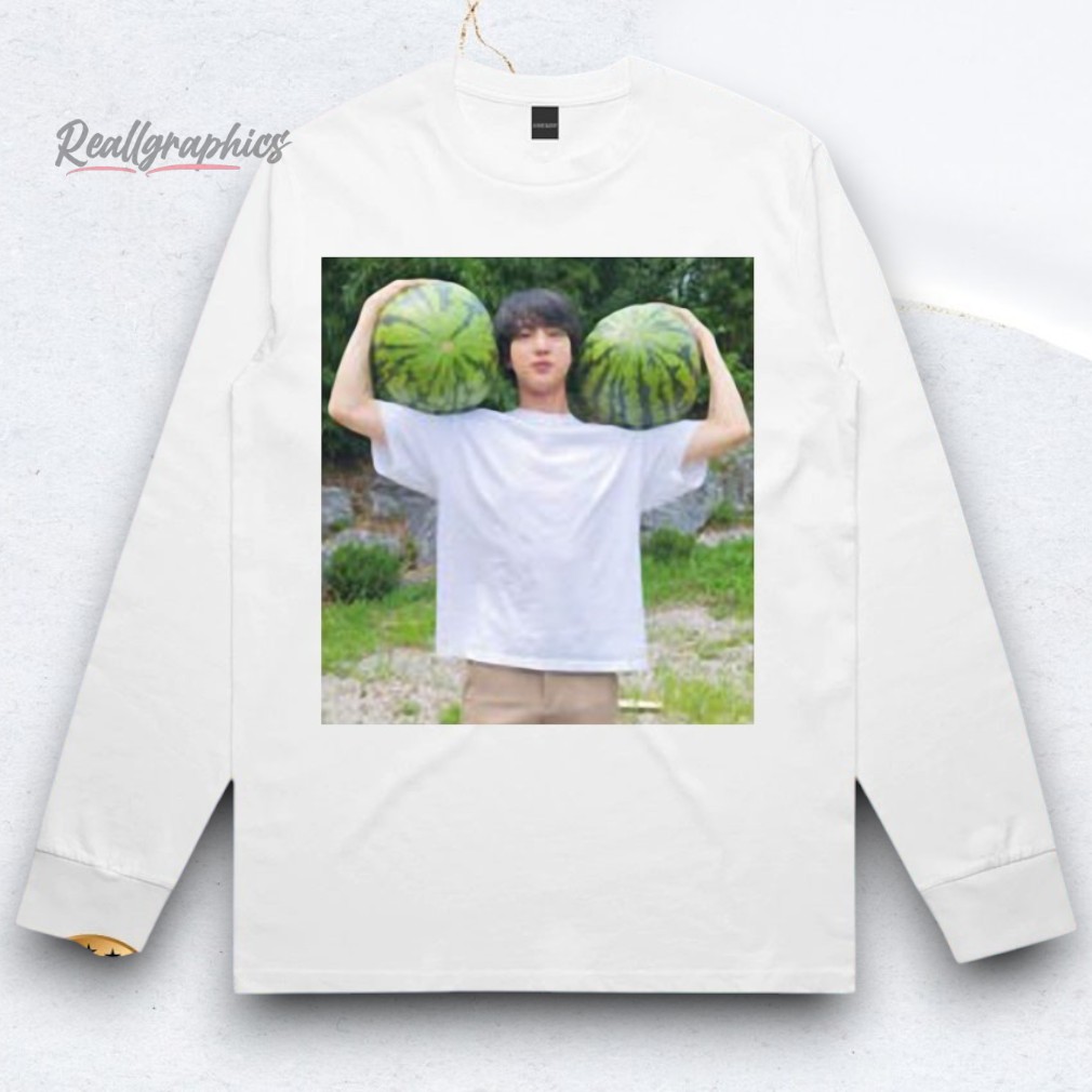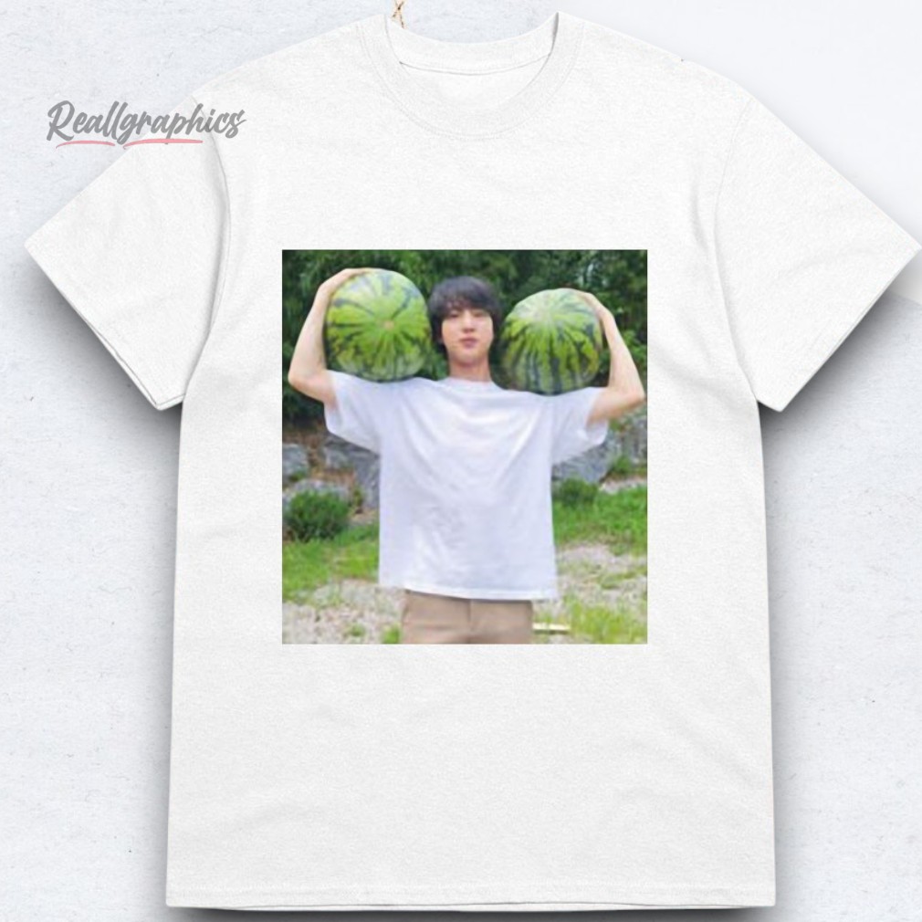 OMG! Jin looks absolutely adorable in this watermelon shirt! 🍉 The playful design is so fun and vibrant. He really knows how to pull off any look! This pic made my day! Jin Photo With Left And Right Watermelons Shirts