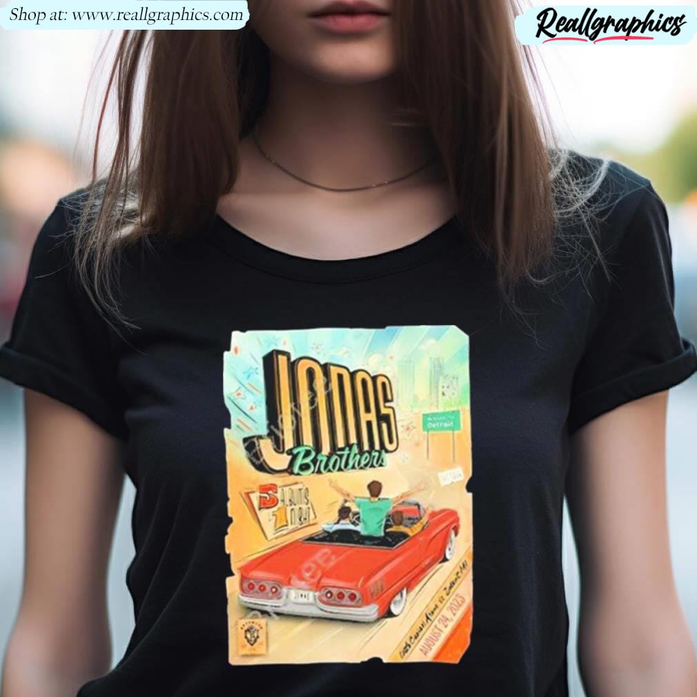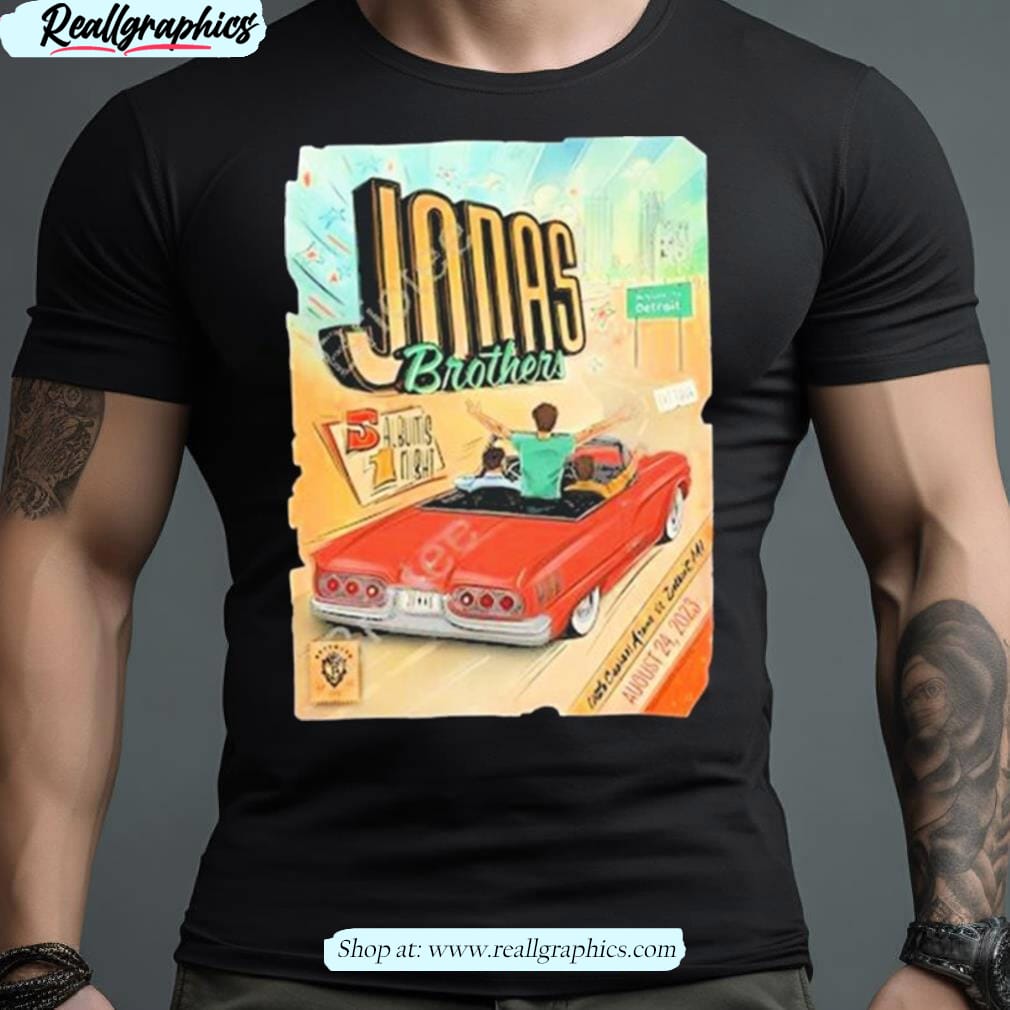 The Jonas Brothers' tour merchandise for their Detroit concert is a true work of art. The design of the shirt features a vibrant combination of colors and patterns that immediately catch the eye. The use of bold typography adds a trendy and modern touch to the overall look. The shirt captures the energy and excitement of a live concert, making it the perfect keepsake for fans who attended the event. With its unique and eye-catching design, this shirt is sure to become a favorite among Jonas Brothers fans and collectors alike.