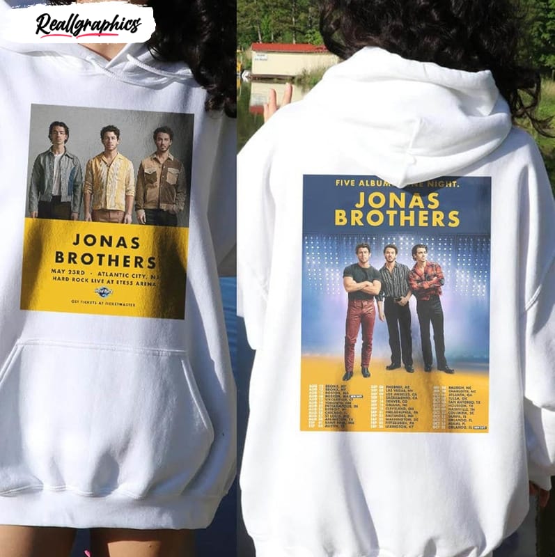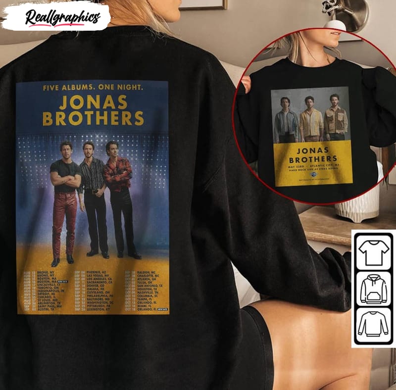 The Jonas Brothers Music Concert Five Albums One Night Shirt is a must-have for any JoBro concertgoer. Featuring a classic black and white design, the T-shirt boasts the Jonas Brothers' logos across the chest in a bold font to really stand out. The album covers for five of their studio albums are printed on the back, giving fans a chance to proudly show off their favorite albums with ease. The lightweight cotton blend of the shirt was specially designed to ensure maximum comfort during those long nights at a concert. With stylish flair and unbeatable convenience, the Jonas Brothers Music Concert Five Albums One Night Shirt is the ideal choice for die-hard Jonas Brothers fans.