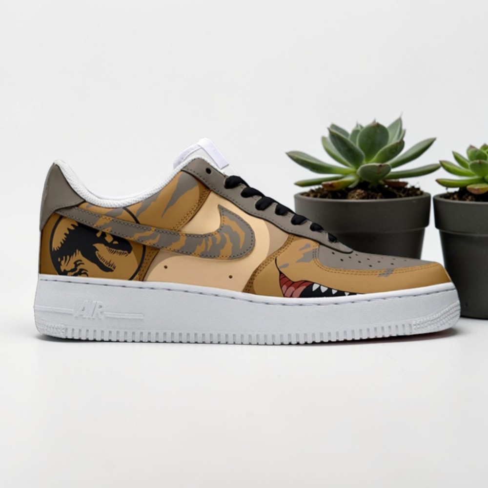 The first glimpse is of a jagged dinosaur jaw stretching along the side, its teeth nearly bursting from the tan camouflage leather. This is no delicate print but a bold, almost primal graphic that anchors the sneaker's adventurous spirit. The silhouette carries the familiar Nike-inspired Air Force 1 shape, sturdy and balanced, while the clean white sole grounds the wild energy above it. The color palette—a sandy mix of browns and beiges—evokes the dusty terrains where giants once roamed, giving these shoes a story beyond mere style. Subtle dinosaur head motifs peek through the camo, layered just enough to reward close attention but not overwhelm. The absence of visible typography leaves the design free from distractions, letting the artwork speak directly to those who wear it. These shoes pull double duty: they’re playful and action-ready without tipping into childishness, striking a tough yet fun vibe. Anyone who vibrates with dinosaur lore or brings a bit of pop-culture edge into their daily fashion would find something compelling here. Teenagers hunting for a standout piece and adults who want a nod to Jurassic World without screaming “collector” simultaneously can claim these. They fit right alongside casual jeans or even streetwear layered with graphic tees and jackets that hype the energetic spirit beneath. The Jurassic World T Rex Air Force 1 Shoes don't just show fandom—they celebrate it with a confident roar, crafted for footfalls that want to be noticed.Jurassic World T Rex Air Force 1 Shoes