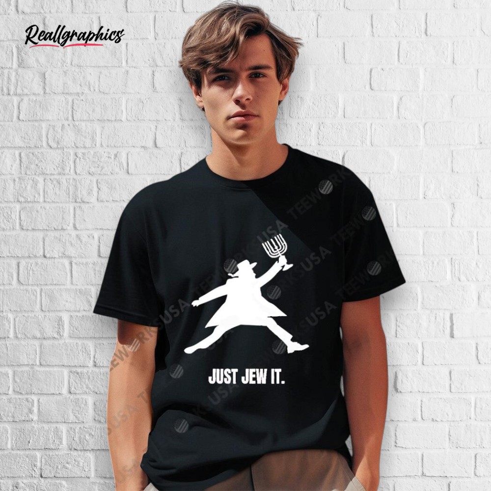 Express your unique identity with this bold and eye-catching statement tee. Designed for comfort and style, it's a conversation starter that lets you wear your pride. Available in various sizes and colors. Get yours today and make a statement! Just Jew It Shirt