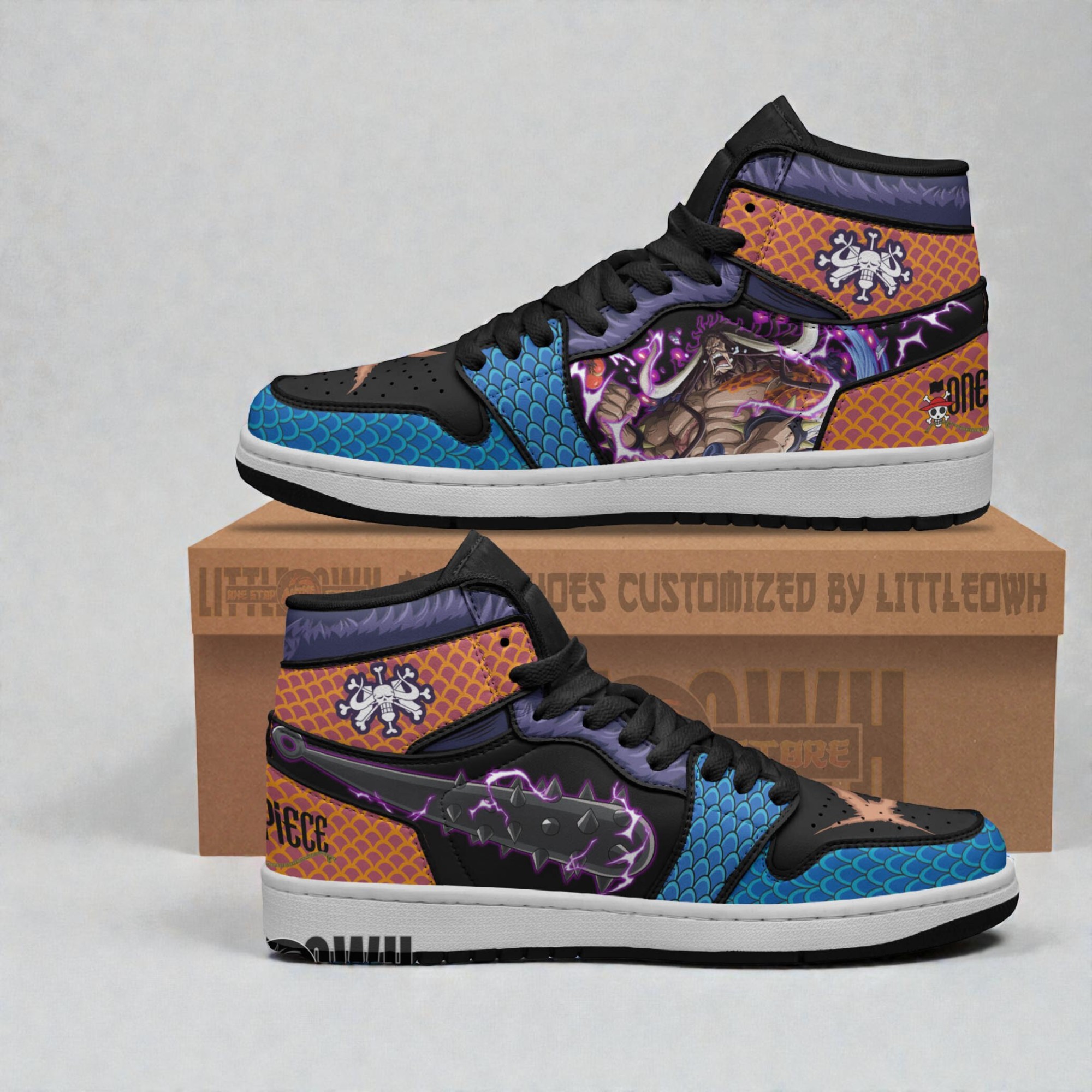 You know that rush when you catch a fierce battle scene in your favorite anime and every detail just pulls you in? These Kaidou anime shoes tap into exactly that energy. The design doesn’t just hint at the series—it delivers a full-on visual punch. Imagine dragon scale patterns rolling across the sneakers, rich teal blues shimmering alongside crackling purple lightning accents. A bold skull crest anchors the look, while starburst highlights flash like sudden bursts of power. It’s like wearing a dynamic battle scene underfoot, every step charged with intensity. These kicks aren’t just for anyone—they’re made for die-hard anime fans and sneaker collectors who crave something beyond the ordinary. If you get hyped over intricate artwork and want your style to shout your passions, this is the kind of custom sneaker that feels like armor for your daily grind. They hold a heroic vibe perfect for anime conventions, casual hangouts, or just when you want a piece of that fantasy energy in your stride. Thinking about a gift? It’s a strong move for anyone obsessed with bold footwear and the wild worlds of anime. Whether it’s a treat for yourself or a surprise for a loved one who lives and breathes animated adventures, these Kaidou anime shoes stand out without ever feeling over the top.