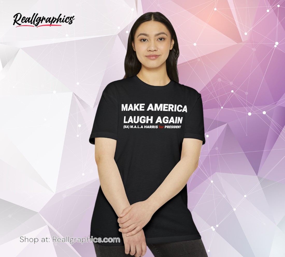 Step into a world of wit and style with our latest apparel sensation! This shirt not only celebrates the jovial spirit of one of America's leading voices but does so with a dash of humor and grace. Ideal for those who appreciate clever satire and empowering fashion, it’s an absolute must-have for making a statement with a smile.Kamala Harris Make America Laugh Again Womenshirt