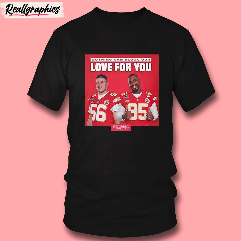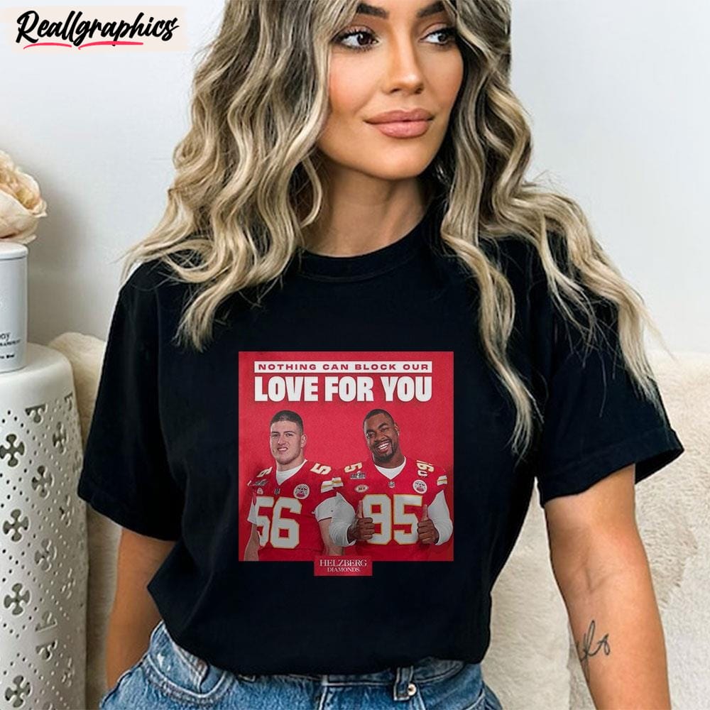 The Kansas City Nothing Can Block Our Love For You Unisex Shirt represents the strong bond between the fans and the city of Kansas City. The design features a beautiful typography and a silhouette skyline, reflecting the pride and love residents have for their city. Perfect for fans of all ages, this shirt is a symbol of unity and loyalty among the Kansas City community. It is a timeless and versatile piece that can be worn with pride on any occasion.
