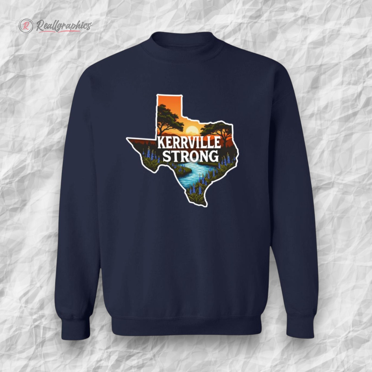 There’s something striking about how the bold white outline traces the Texas silhouette, almost like a beacon standing firm against a sunset sky. This design isn’t just a graphic; it’s a story told through a river and lilies scene gently unfolding beneath the words “KERRVILLE STRONG” in all-caps, bold sans-serif letters. The layered text commands attention without overpowering the calm yet determined natural imagery, capturing both resilience and hope in one frame. Anyone who calls this part of Texas home—or feels connected to its community spirit—will recognize more than just a shirt here. It’s a nod to toughness, to coming together after the flood’s chaos. If you’re a Texan who’s stood through these challenges, or someone wanting to show support for those who have, this piece speaks volumes without saying a word. This is not just gear; it’s meant to be worn while pitching in on a relief day, or simply around town when you want to carry a bit of that shared strength with you. Likewise, it fits silently yet meaningfully in a care package for volunteers or flood-affected families. It’s about connection, pride, and an unshakeable belief in the community’s heart—something that turns a basic hoodie into a symbol of Kerrville’s strong spirit.